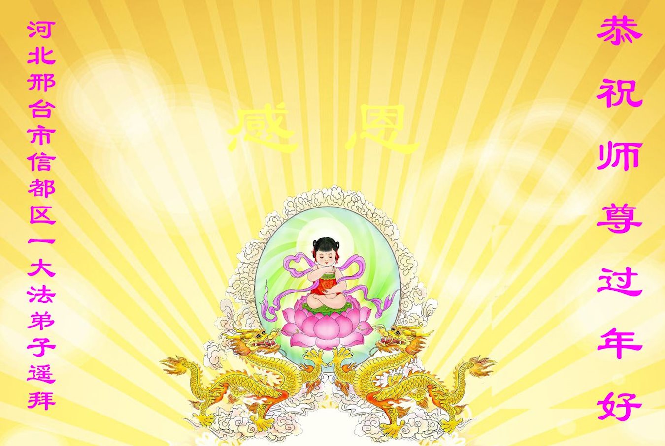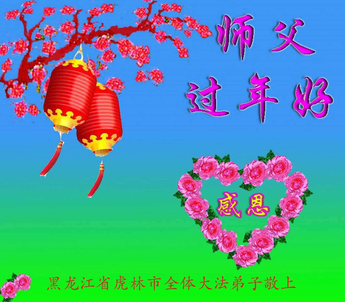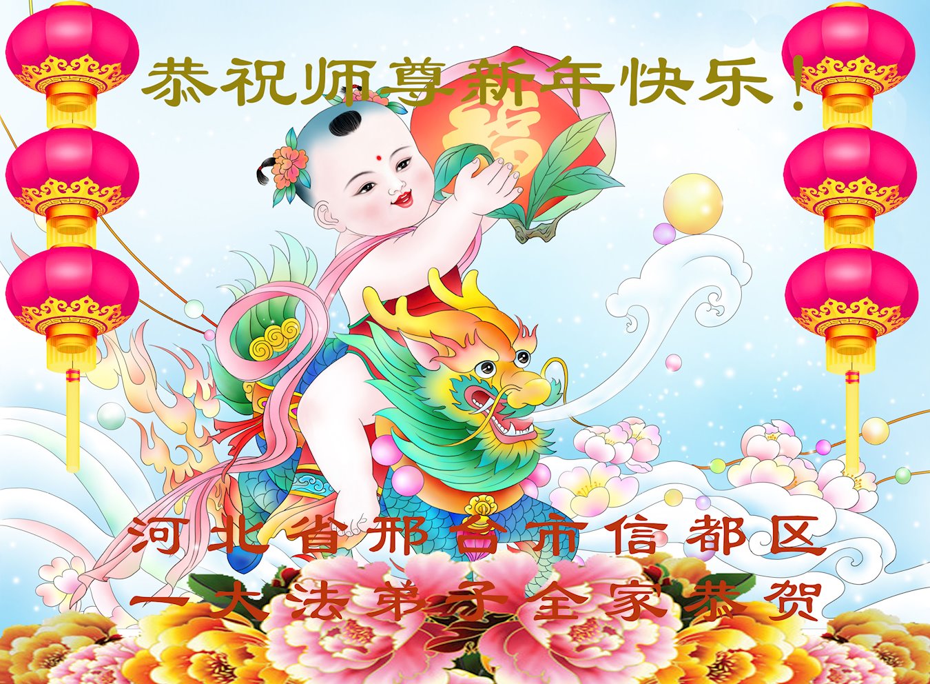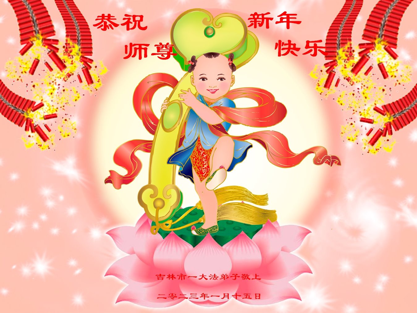 在中国传统大年来临之际,我代表全家人,向慈悲伟大的李大师拜年!献上最诚挚的感恩和祝福:感谢大师佛恩浩荡,慈悲救度!使我们全家身心受益,和睦幸福!万事如意!恭祝大师新年快乐!