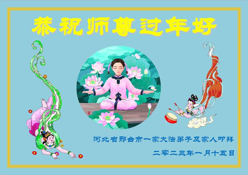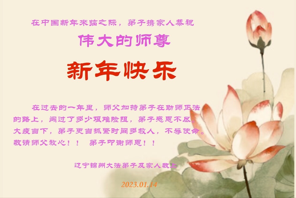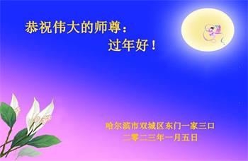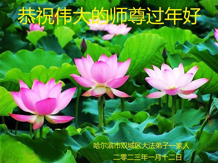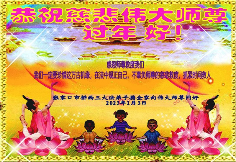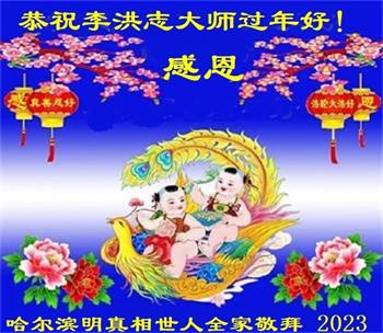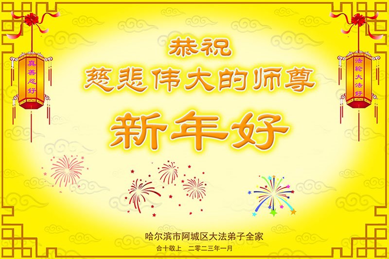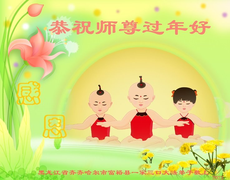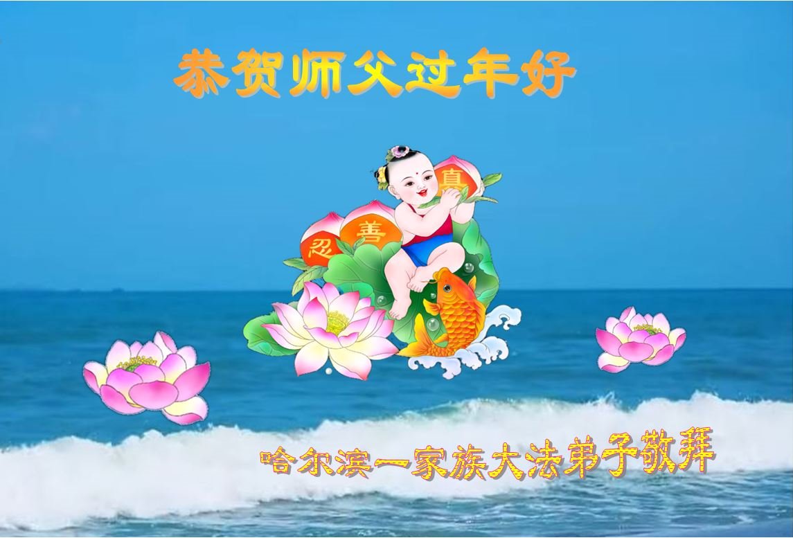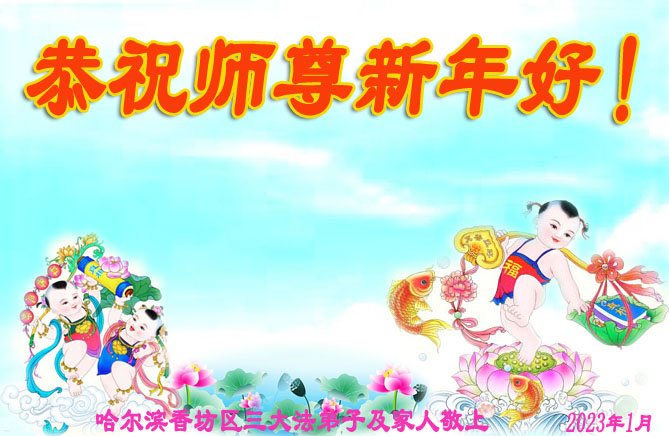 黑龙江哈尔滨市市民代表全家人,向慈悲伟大的李大师拜年!信中说:我市区几乎百分之九十的人染疫,疫情中人们普遍感到无助、压力和恐慌。而我们全家也有多人染疫,但症状很轻。因为我们心怀善念和感恩,诚念“法轮大法好,真善忍好”,在您的慈悲保护下,全家人都平安渡过劫难。