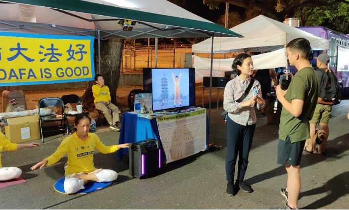 一天我跟老伴说,这俩人老是说法轮功如何如何好,如何如何神奇,明天我们到法轮功炼功的地方去看看?他说好吧。第二天清晨四点钟,我们来到炼功点上,一看好多人头顶有一轮皓月,随着美妙的炼功音乐,队形整齐,动作划一的在那儿炼着。我一看这不是一般的功法。我不由得被这种祥和的气氛感染了,也情不自禁的跟着比划起来……