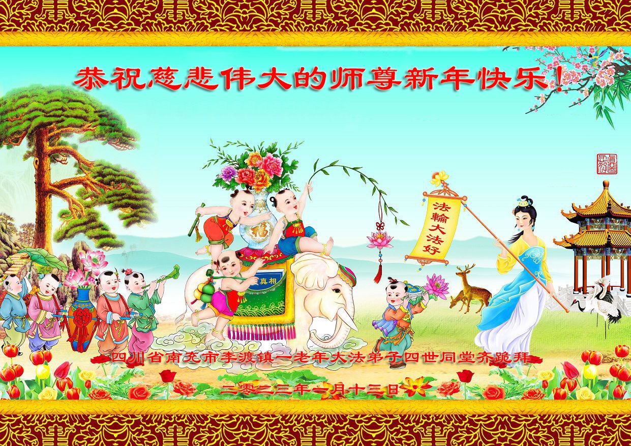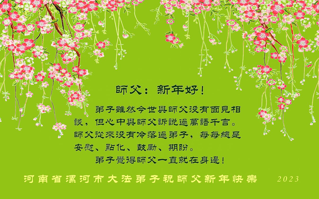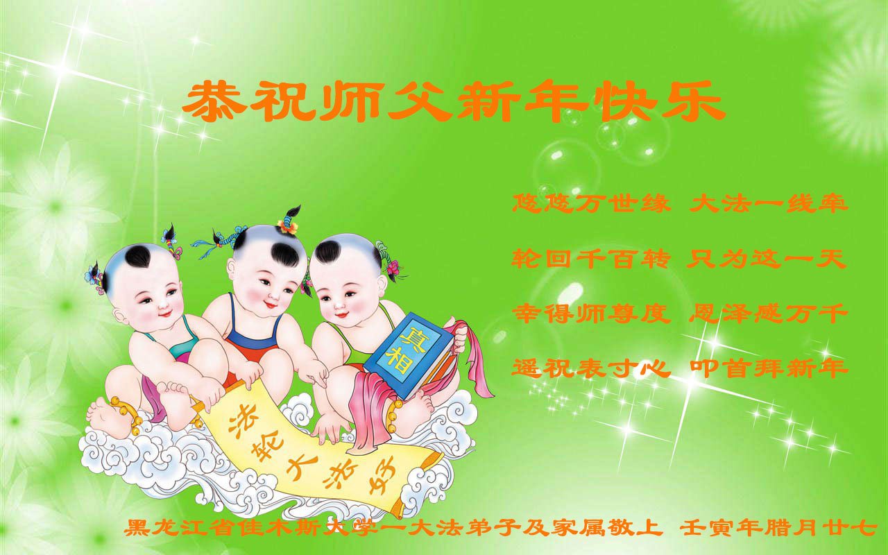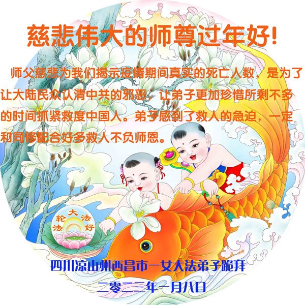 【明慧网二零二三年一月二十一日】2023年中国新年到来之际,中国大陆各民族大法弟子们恭祝李洪志师父新年好!更盼望师父早日回国和弟子们团聚。大法弟子在贺词中写道:“我们时时沐浴在佛恩浩荡中,因为有大法导航,我们不再迷茫;因为有大法指点迷津,我们充满智慧和理性;因为有大法护佑,我们幸福无比。我们时时盼着您早日回中原。”