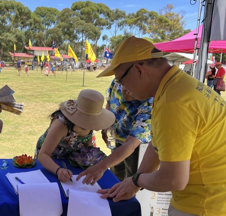 越南人洪(Hung)带家人来到法轮功学员在越南新年活动的展位签名支持法轮功。他说:“中共的迫害、活摘器官,非常邪恶,我希望这些迫害立即结束。”洪说看到过法轮功学员在阿德莱德市中心和唐人街的炼功讲真相活动,很祥和。他祝福法轮功师父和法轮功学员新年好。