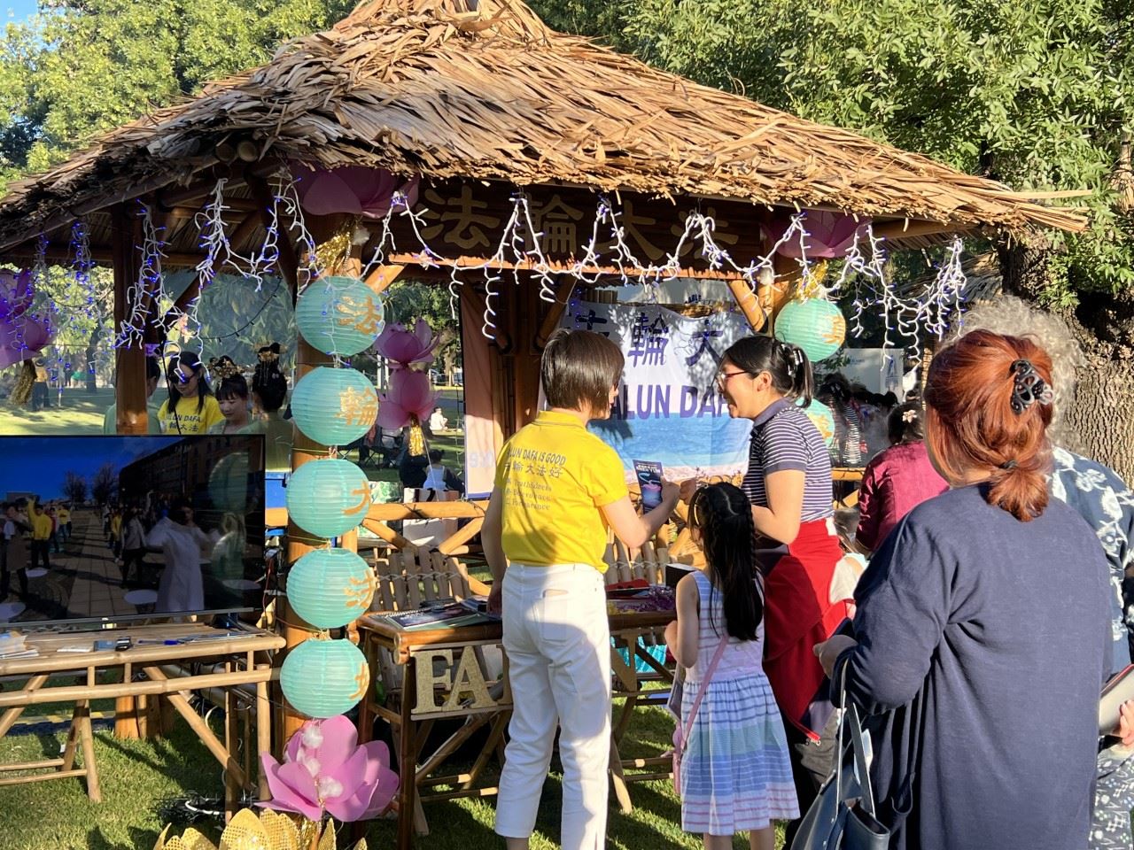 主办人特蕾莎(Teresa)对法轮功学员表演的唐装舞蹈和装饰的展位赞不绝口,并感谢学员的到来。她对学员说:“非常感谢你们带来的美丽的舞蹈表演和法轮功展位,我非常喜欢,我也这样告诉一些来游园的大陆华人,我喜欢法轮功,他们人很好。”