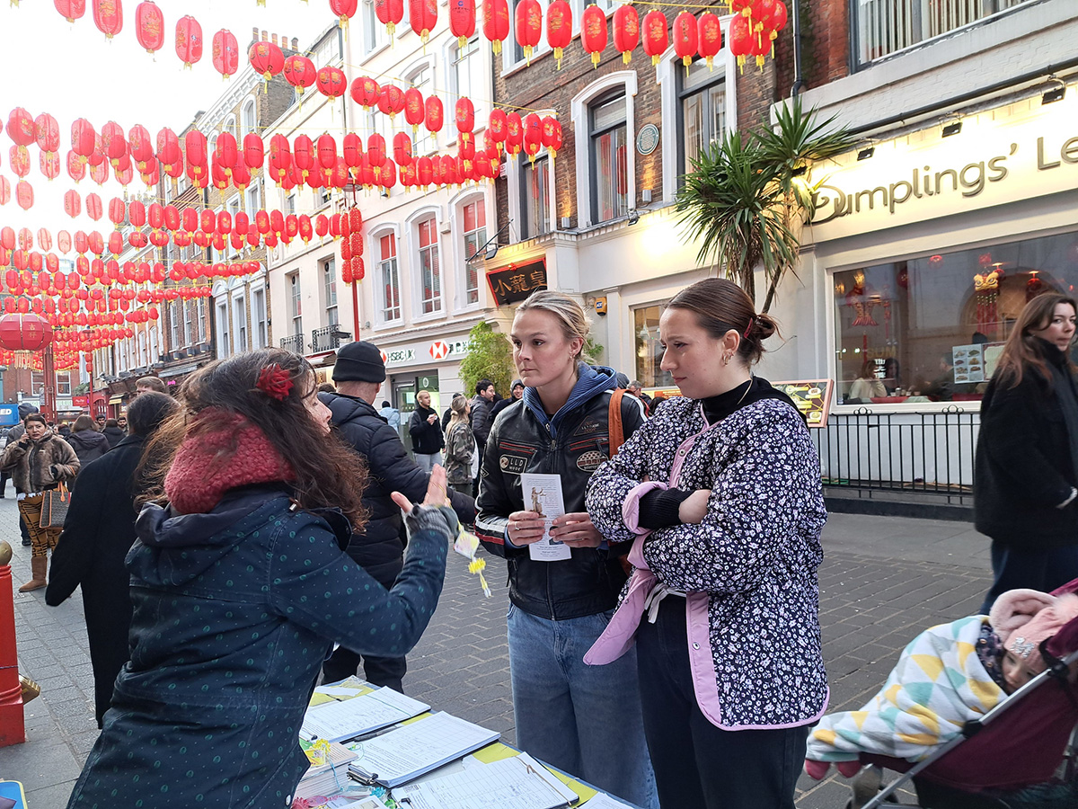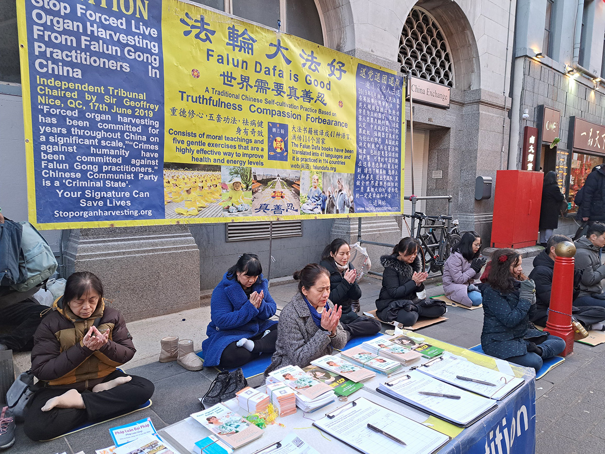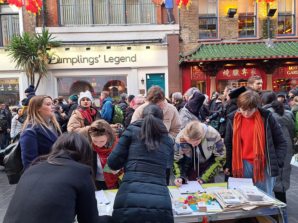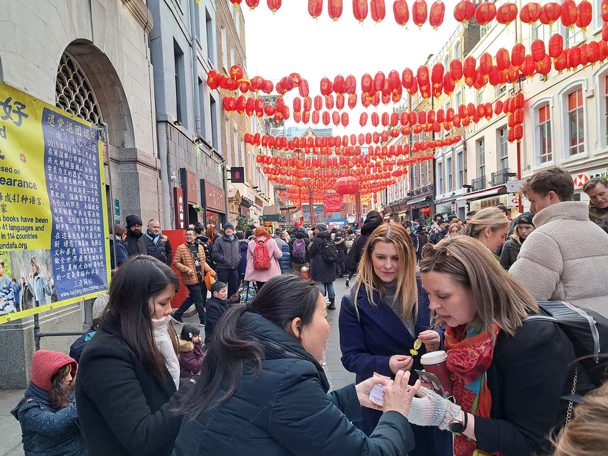 因为今年除夕及中国新年正好是周末,人潮络绎不绝,不少人过去听说过法轮功在中国大陆受迫害,也听说过中共活摘器官的罪行,人们纷纷主动过来签名支持;也有很多人停下来了解真相。现场发送印有法轮大法好、真善忍好的小莲花欢迎来自世界各地的民众。