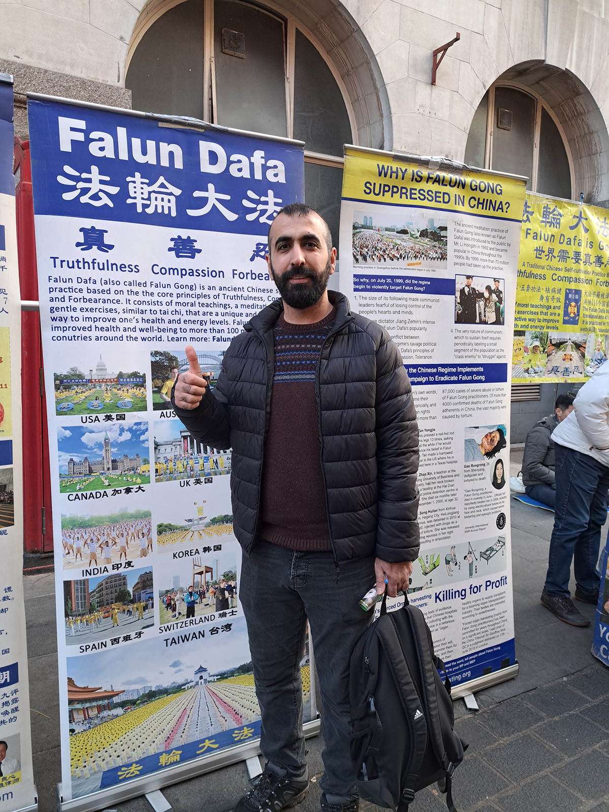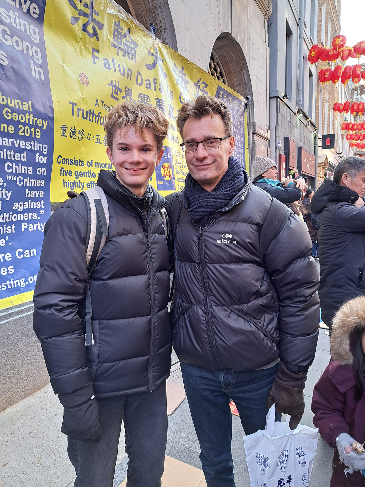 大年初一,理查德(Richard)主动前来询问并索取法轮功传单及迫害的相关讯息。他来自西班牙马德里。他表示他对法轮功的了解很少,因为他的工作,过去在世界各地经常看到法轮功的摊位,他通常只是经过未曾停留,但今天在唐人街沉浸在中国新年这样的气氛下,他决定停下来拿些资料回去了解并学习法轮功。“就我的了解,法轮功可以促进健康,给自己带来平静,我需要学习并进一步了解他。”