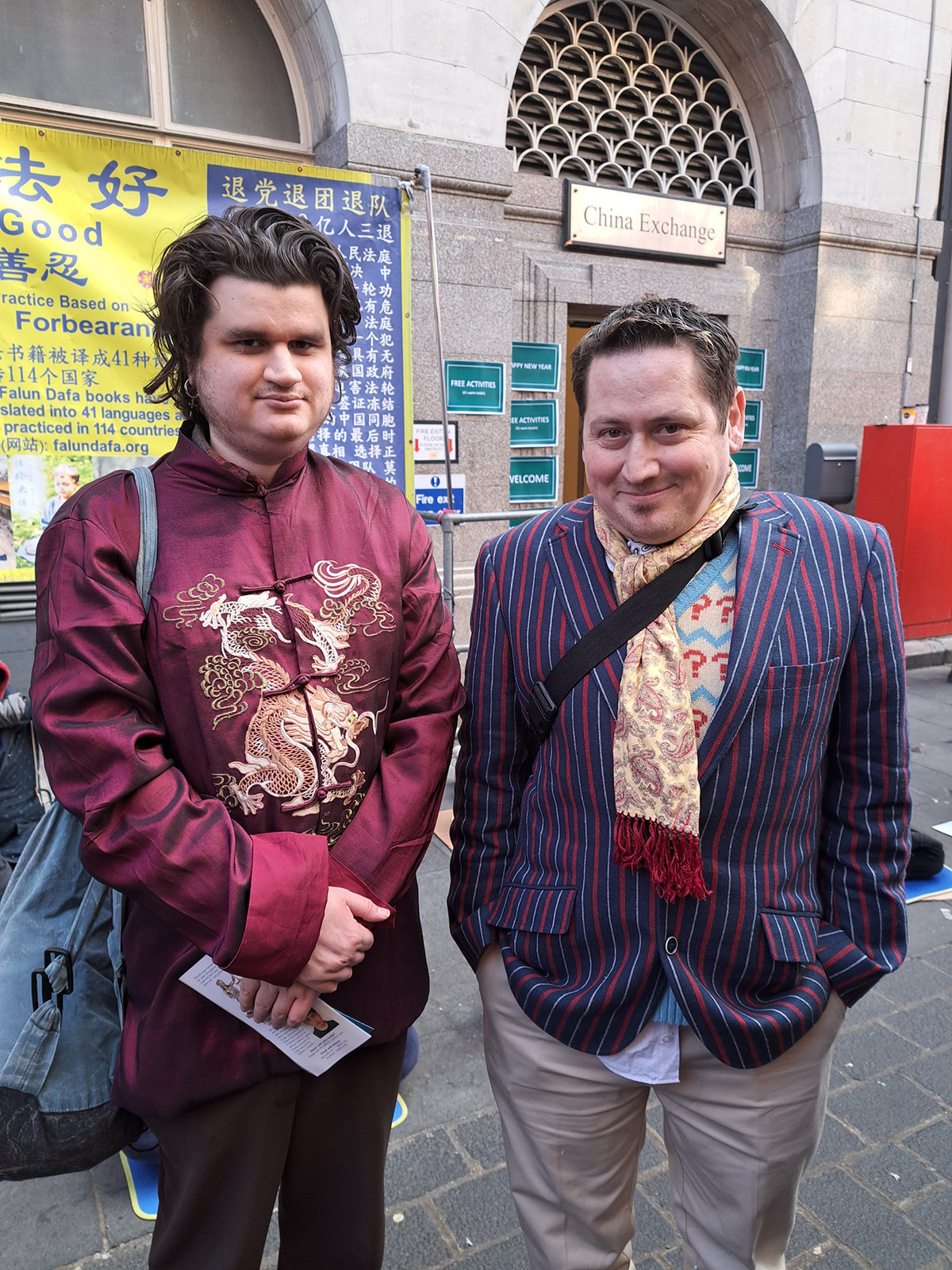 金融业的营运总监西蒙·皮尔逊(Simon Pearson)和十四岁的儿子奥利·皮尔逊(Olly Pearson)一起驻足观看法轮功学员展示功法。皮尔逊在新加坡学的一口流利的中文,中文名字叫沛实。在他多语种能力中,最喜欢的是中文,并全程用中文交谈。