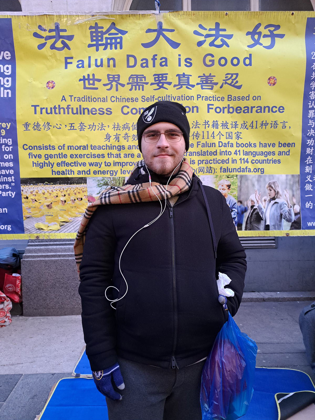 乔伊表示他也是佛教徒。今天经过这里看到法轮功学员在静坐,才让他有机会了解这些事,认识真、善、忍这样的价值。