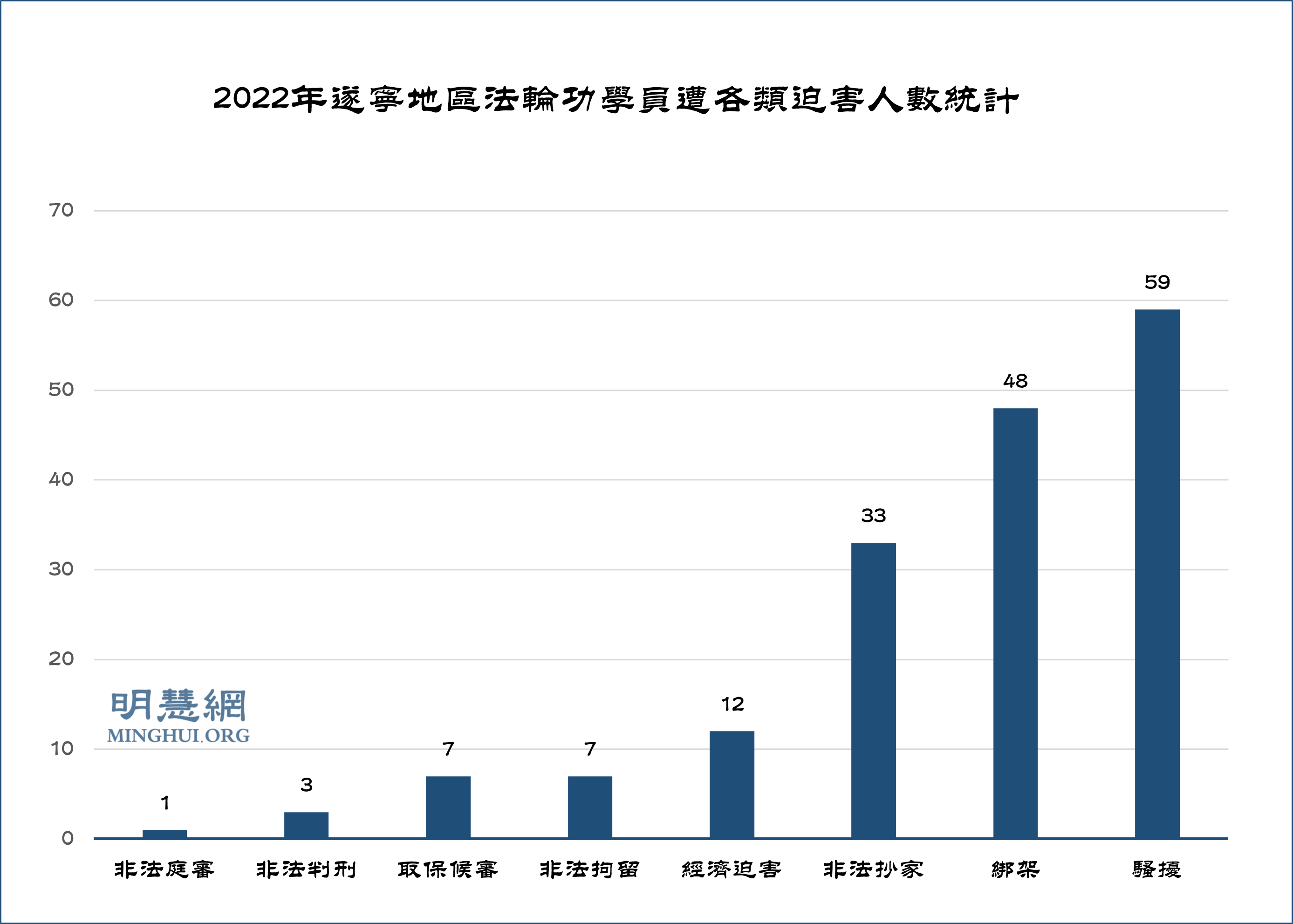 据明慧网报道的不完全统计,二零二二年,遂宁市法轮功学员遭受各种方式的迫害达170人次,其中,1人被非法庭审;3人被非法判刑;48人被绑架(补充去年被绑架的姚忠梅等三人);7人被非法拘留;59人被非法骚扰(有的被多次骚扰);33人被非法抄家;7人被非法取保候审(其中蒋秀云、易琼英与张碧体三人的非法取保候审已取消);12人遭经济迫害(易琼英被抢的七千多元已退还七千元,只有四百六十元没还)。