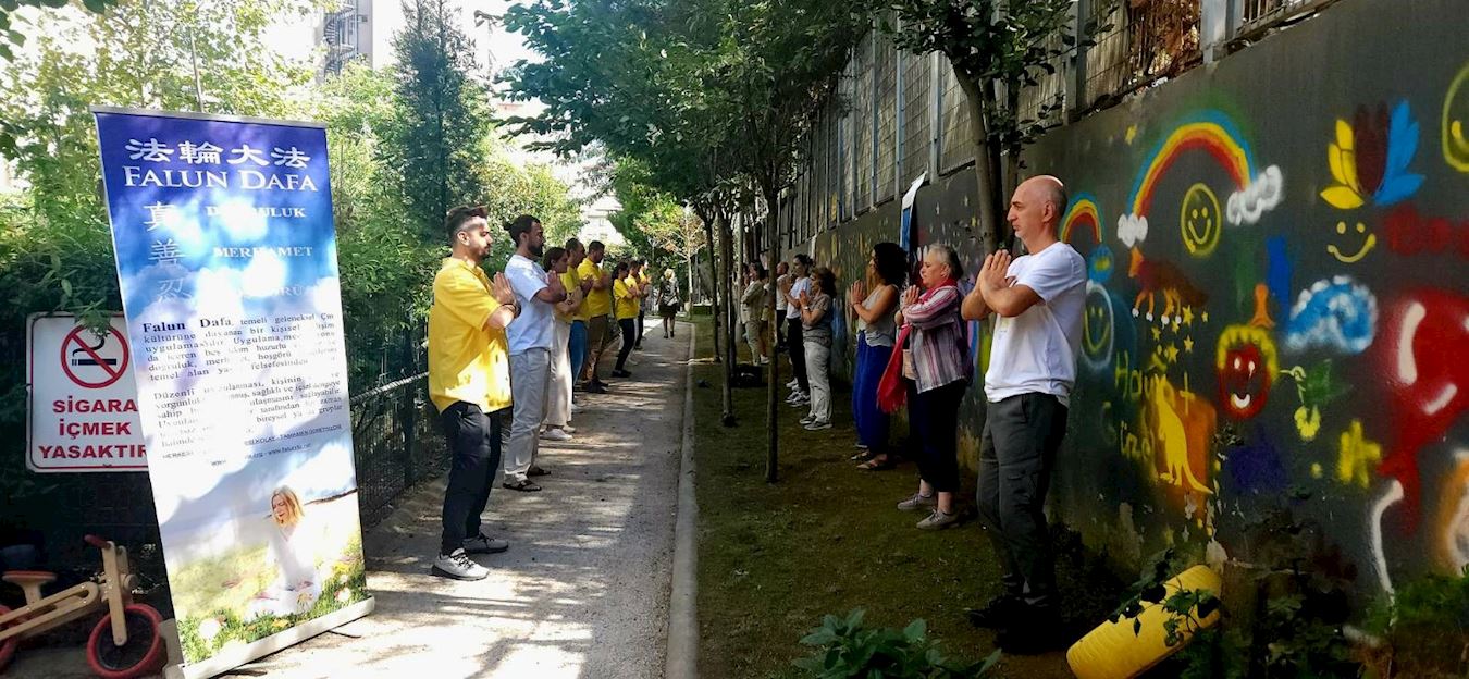 二零二三年九月九日星期六,法轮功学员在伊斯坦布尔卡德柯伊(Kadıköy)的“生态生活中心”举办弘法活动。