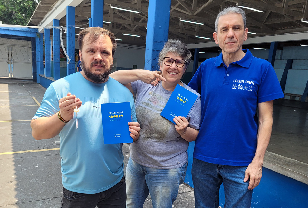 ![]() 图4:若阿金·路易斯·德·布里托公立学校的老师法比奥·德利马(Fabio de Lima,左)和协调人维拉女士(中)很高兴获得一本《法轮功》。 |
