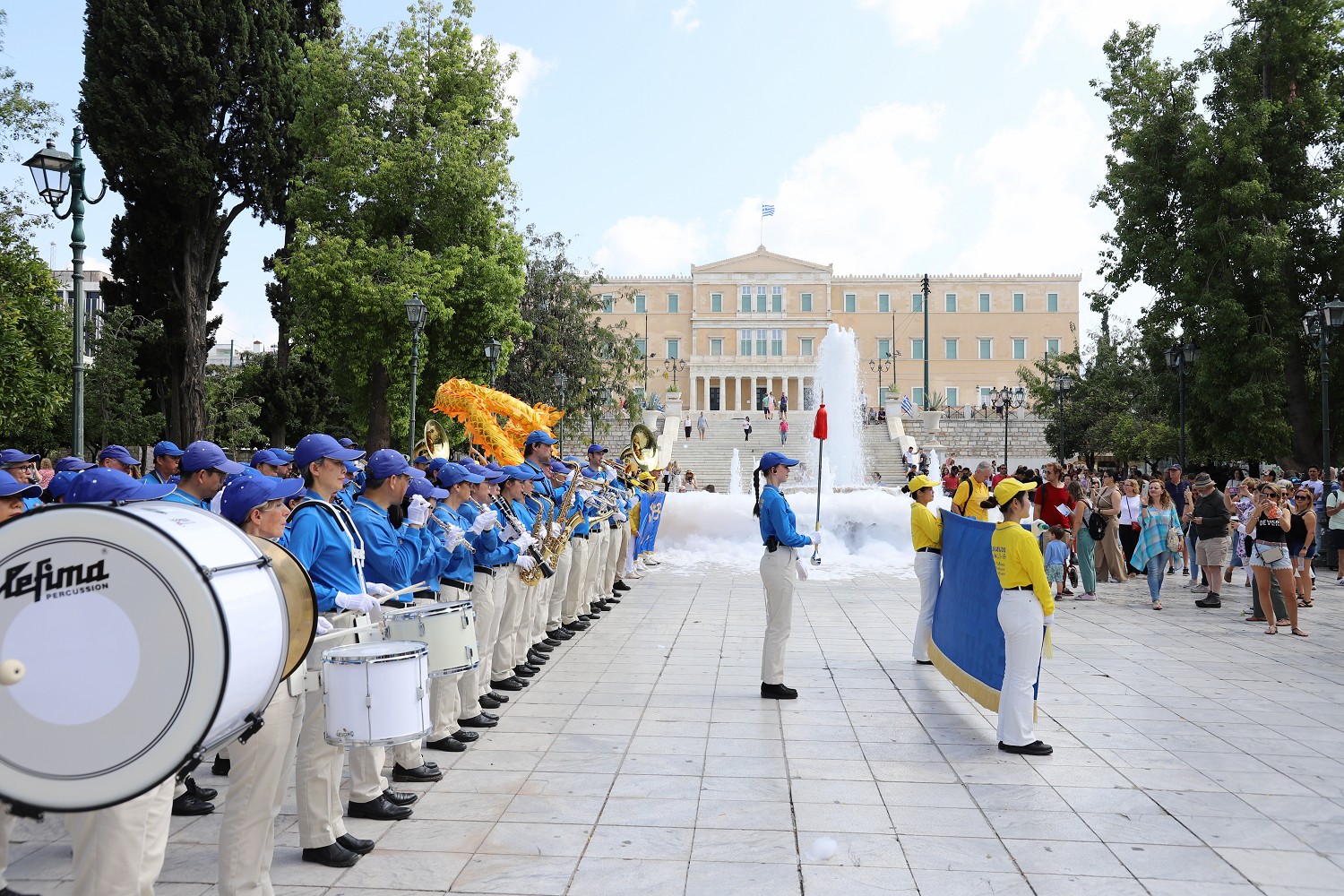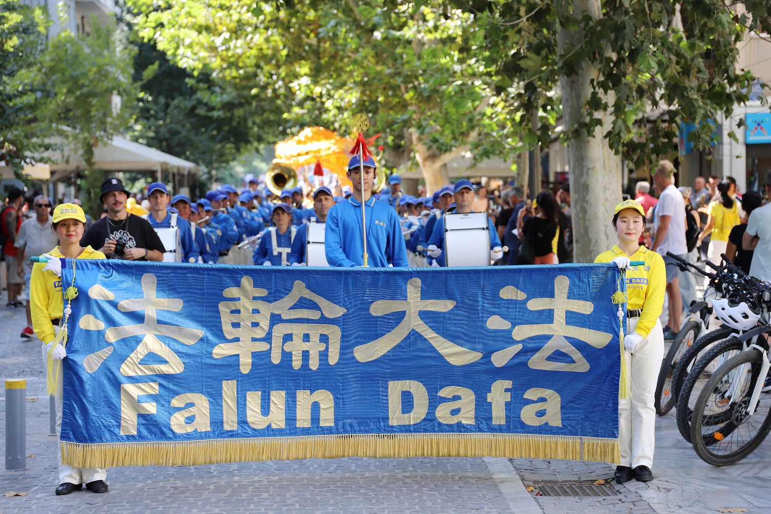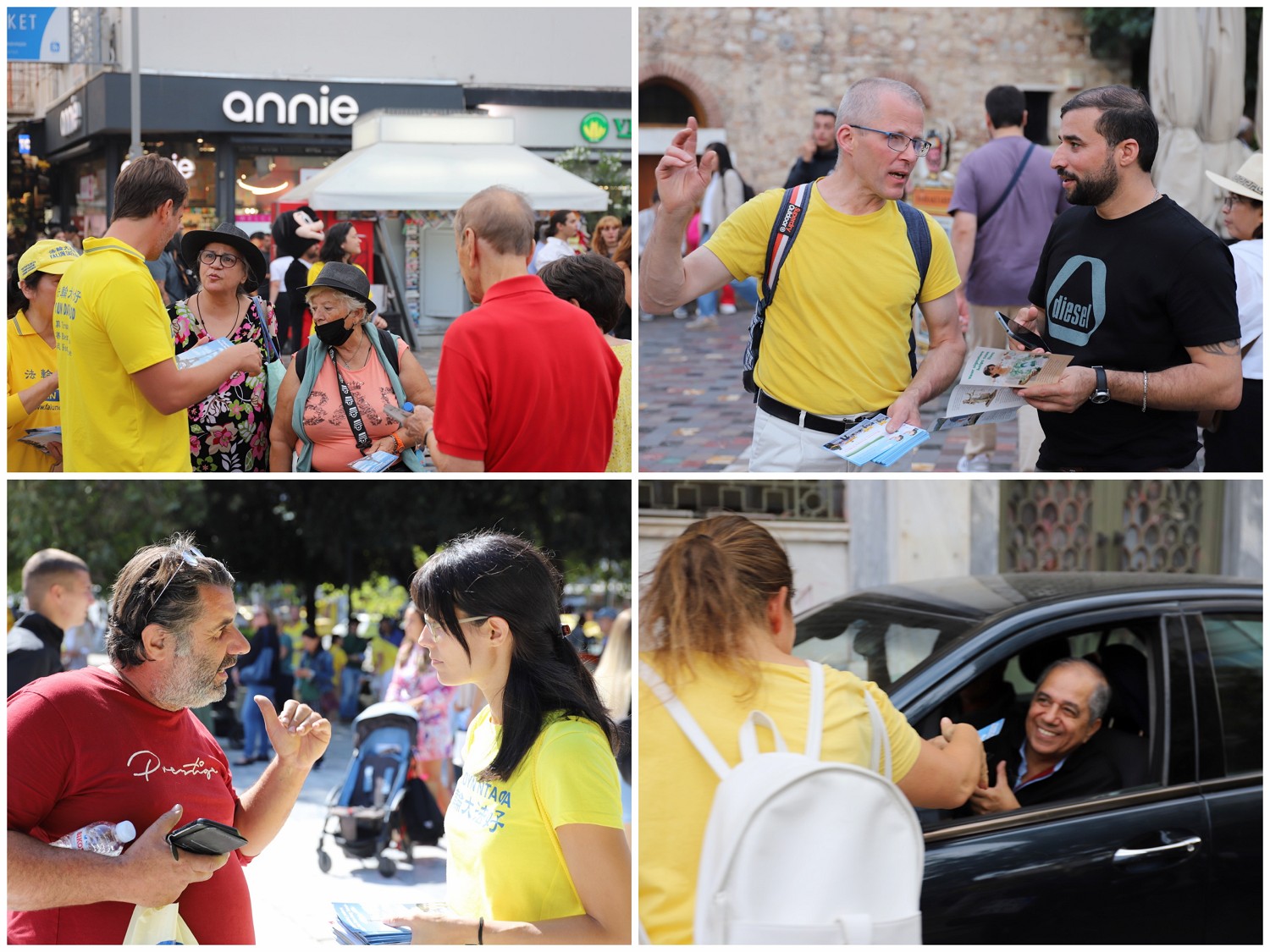 雅典各个广场上都挤满了人群,看到天国乐团和舞龙队的表演,大家纷纷拍照、喝彩。很多人在了解到中共迫害法轮功学员的罪恶之后,纷纷签名声援学员反迫害。