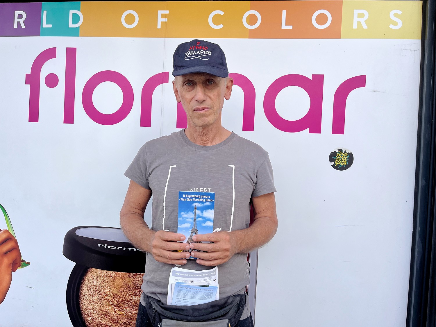 电信公司员工考斯塔斯(Kostas)在蒙纳斯提拉齐广场上工作。欣赏了乐团的演奏后,他向学员拿了一叠真相传单和一些小莲花挂坠,帮着派发给行人。