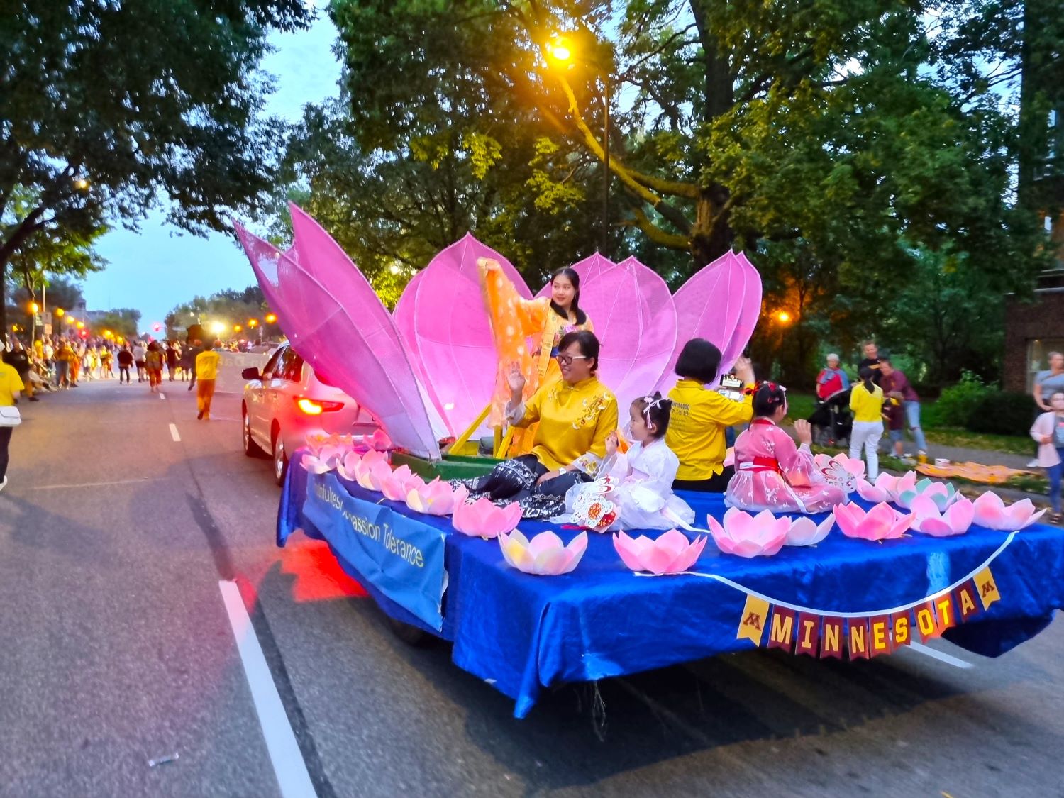 游行开始后,天气温暖舒适。身着五彩唐装的仙女坐在一朵巨大的莲花里,可爱的小学员们身着传统汉服,提着小白兔灯笼,微笑着向人们挥手致意。走在花车旁的学员们忙着分发法轮大法书签和糖果。人们欢呼着“法轮大法好”,向花车上的修炼者挥手、鼓掌,还有人与花车合影、录像。