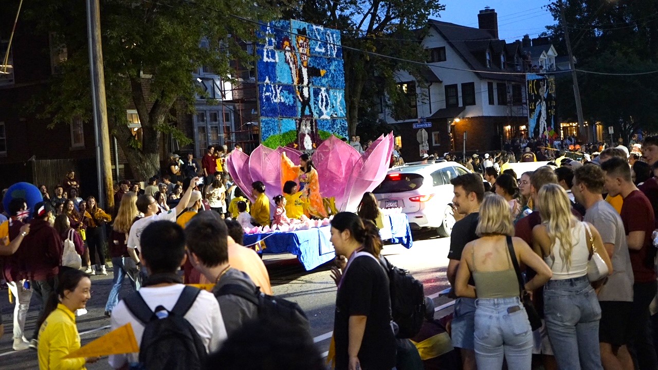 游行当天,刮起大风,下起了大雨。下午两点后,雨停了,乌云散去。下午六点半游行开始前,成千上万的游行者挤满了大学路两侧。在大法花车的上方,出现了一条白云缭绕,一直延伸到天际。