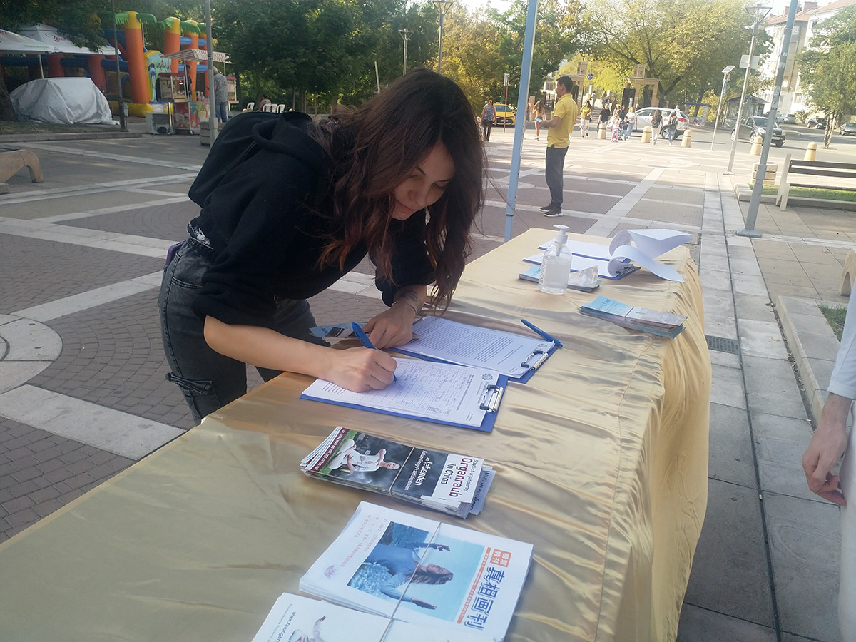 学员们在此设立真相信息亭,向路人介绍法轮大法的美好和中共对法轮功的迫害。许多保加利亚人纷纷支持法轮功。