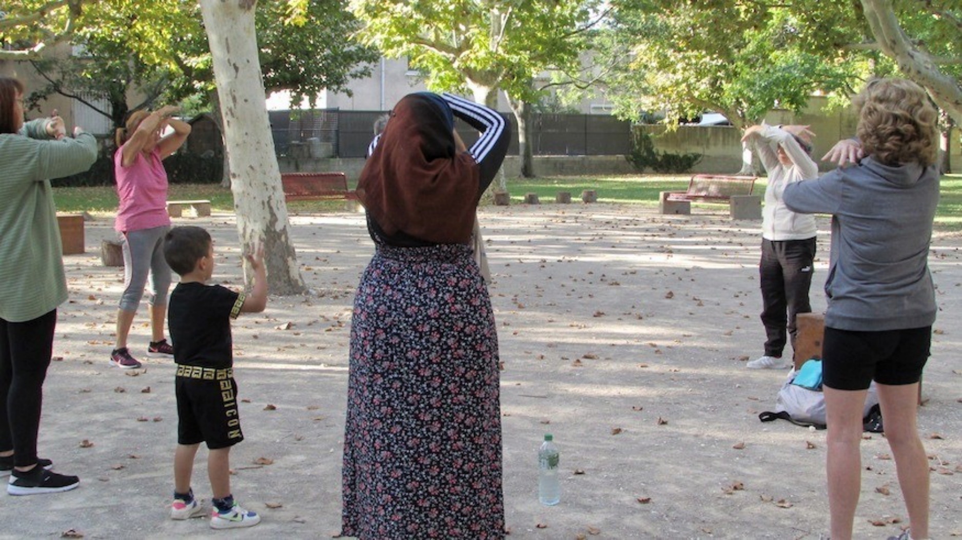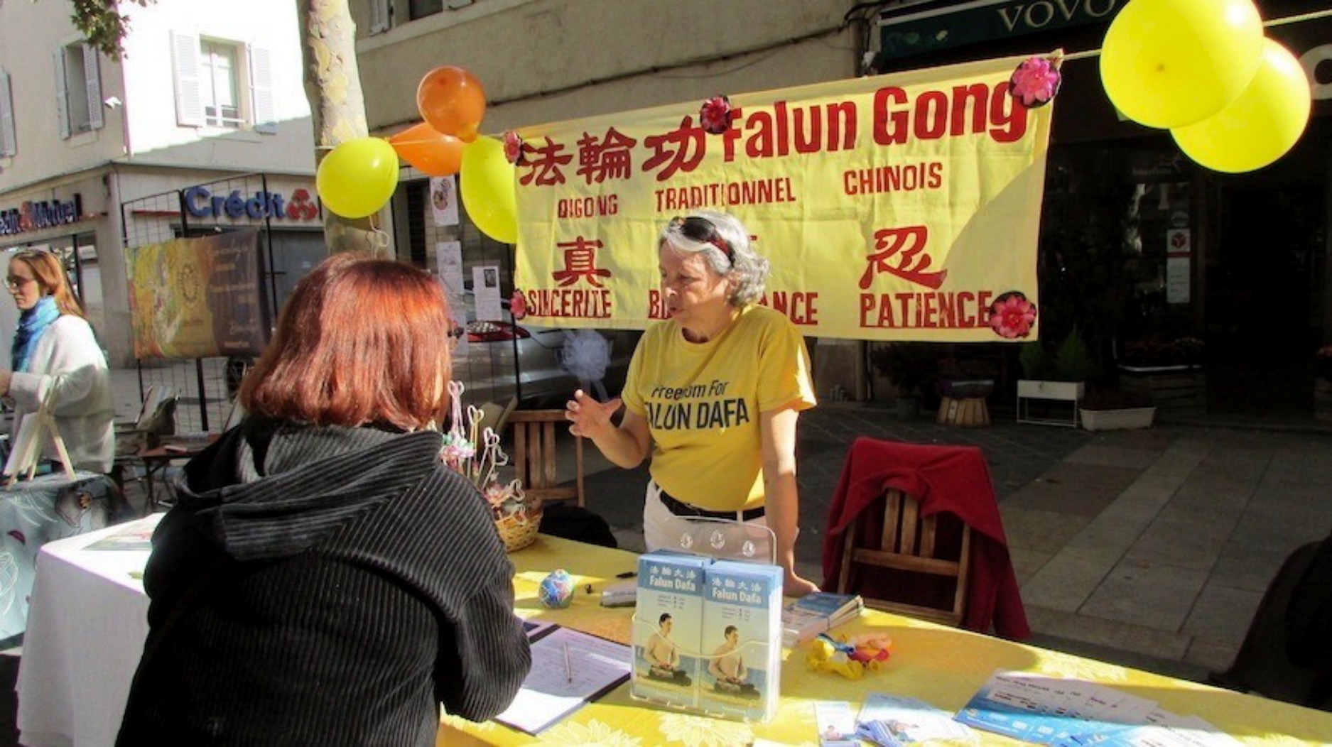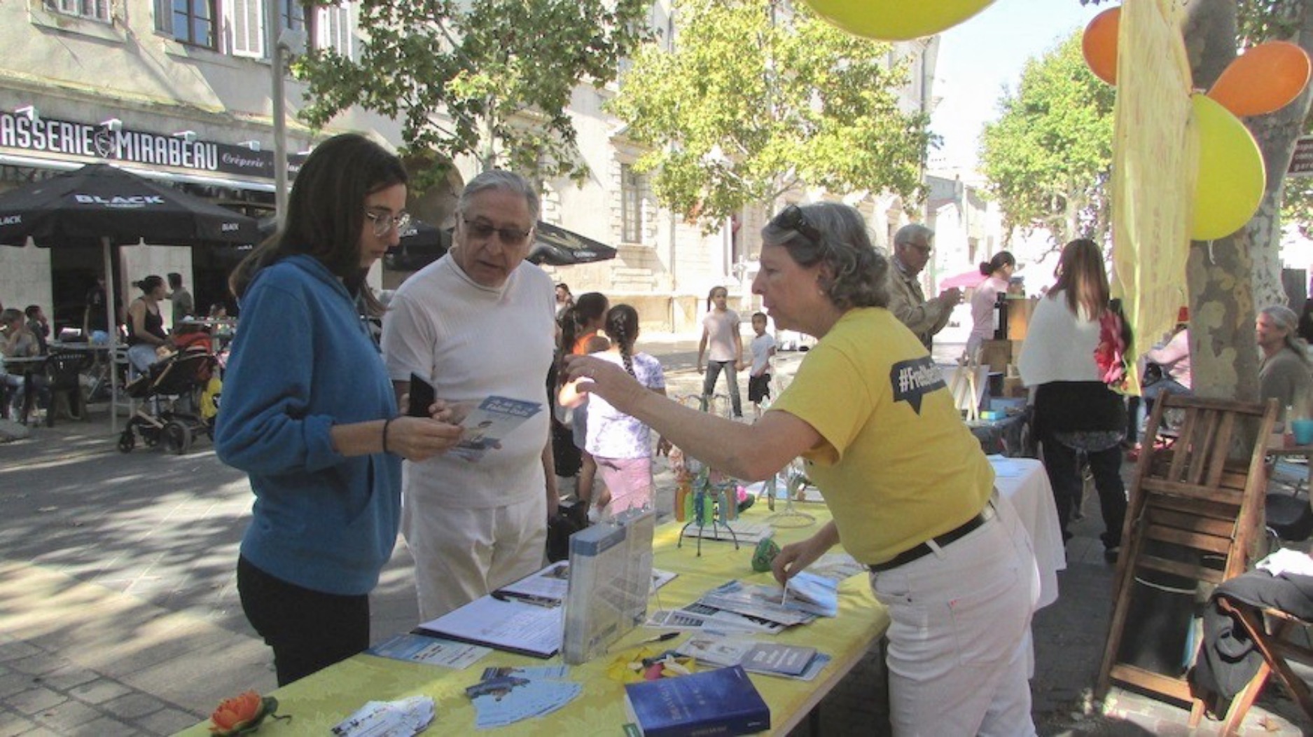 “健康与环境沙龙”次日,十月八日(星期日)上午,在马丽尼亚纳费拉日公园(le parc Ferrage)的炼功点,来了许多人学炼法轮功。其中一个母亲带着儿子,和法轮功学员一起炼功之后表示,他们感到非常的平静。