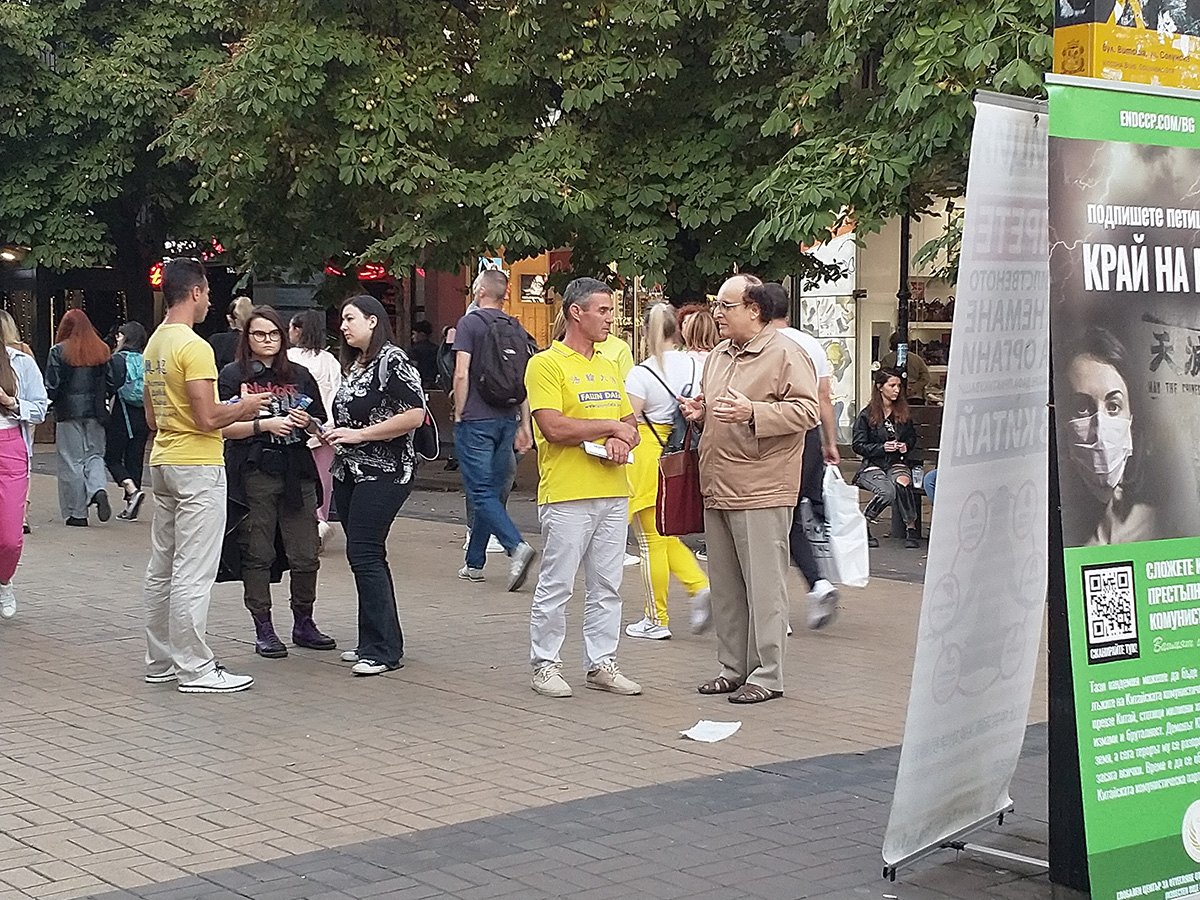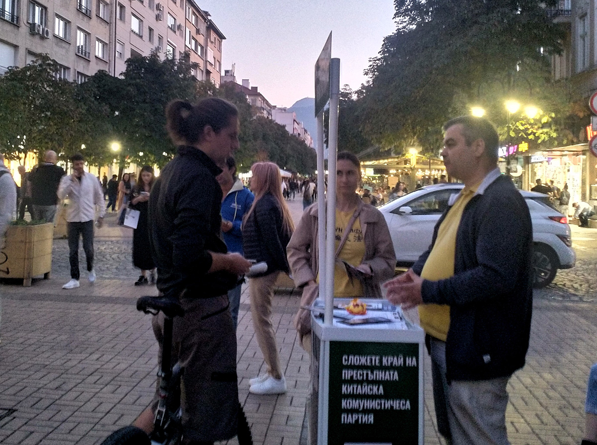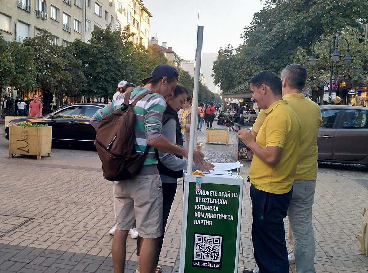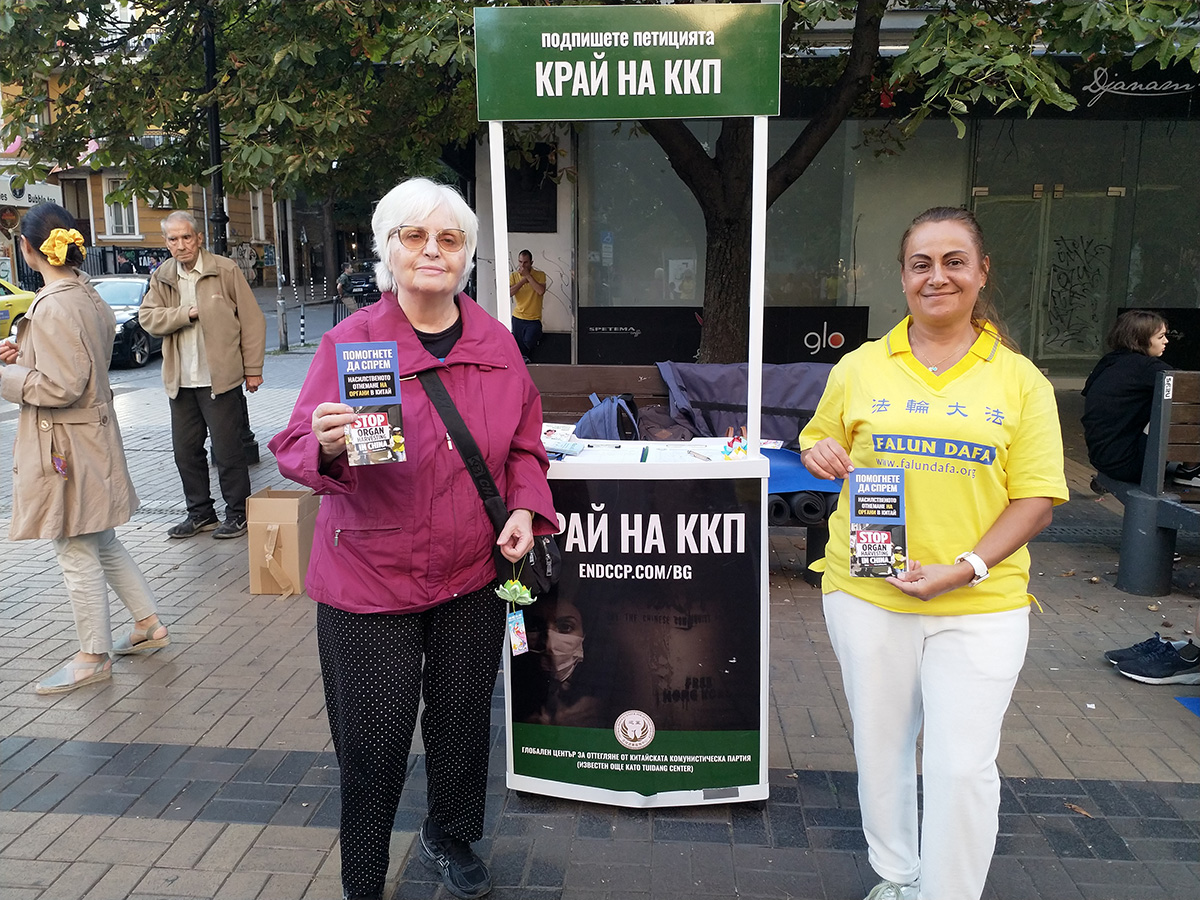 展台上有各种信息资料,两份请愿书供行人签名。其中一份请愿书谴责了中共过去一个世纪以来众多的侵犯人权罪行,包括对法轮功的迫害。另一份请愿书要求保加利亚政府谴责中共活摘法轮大法修炼者和其他良心犯器官的行为,以及要求采取措施,制止中共的合作。