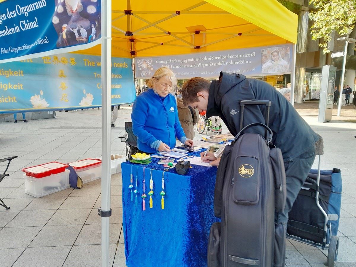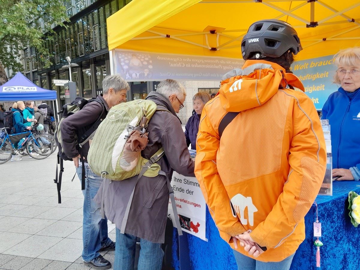 每个想了解真相的人都能从学员那里得到详尽的解答。许多人在反活摘的请愿书上签名。请愿书呼吁德国政府公开谴责中共迫害法轮功并活摘法轮功学员的器官牟取暴利,并呼吁中国(中共)政府停止这些罪行。同时,请愿书要求中共严格执行现有的移植法,执行欧洲议会二零二二年五月五日关于反中国活摘器官的决议。