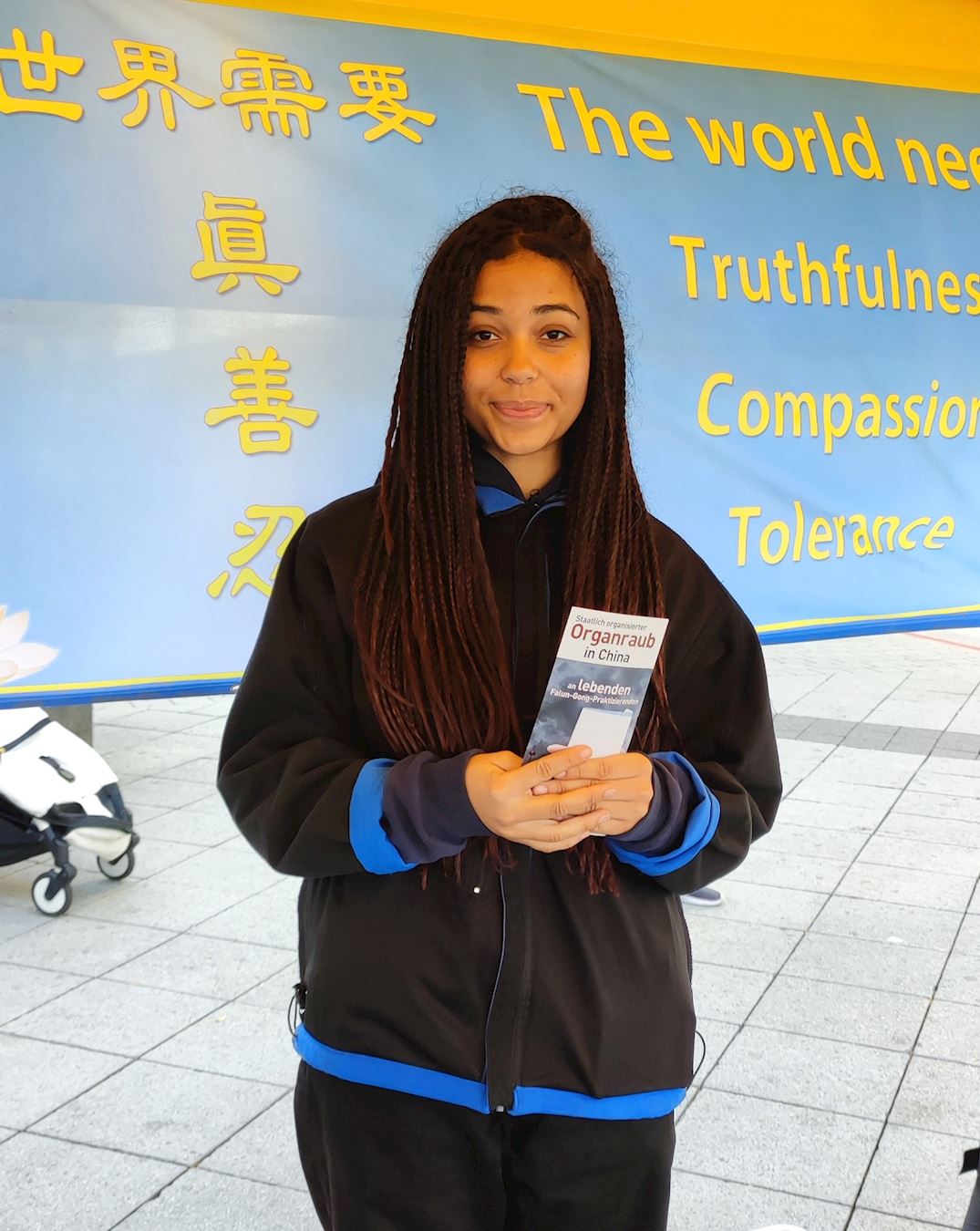 朱丽安娜·施图克(Julienne Stück)是一家国际儿童援助组织的筹款人,因出差来到汉诺威。她看到学员的真相点,就立刻走了过来,并详细地询问什么是法轮大法,为什么法轮大法在中国受到迫害,以及为什么法轮大法修炼者会成为活摘器官的受害者。