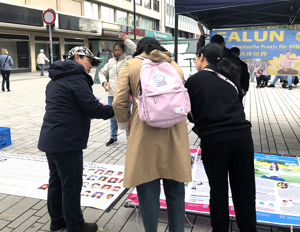 她们告诉学员,自己是来德国出差的,在中国听说过法轮功,但是对迫害并不了解。其中一位女士非常认真地读了展板上的内容,还用手机为介绍五套功法的展板拍了照。当学员告诉她们,所谓的天安门自焚事件是中共的谎言宣传时,两人都点头表示同意。