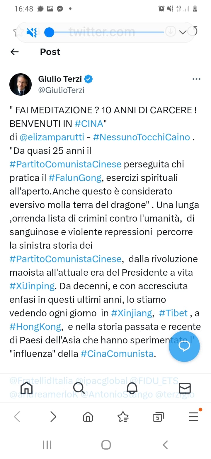 文章发表当日,意大利共和国参议院欧洲联盟政策委员会主席、前意大利外交部长、前意大利驻美大使朱利奥·泰尔齐(Giulio Terzi)发推此文,推文中还提到从毛主义革命到当今的习*近*平时代,一系列令人震惊的反人类罪行,血腥暴力镇压贯穿了中国共产党的邪恶历史。