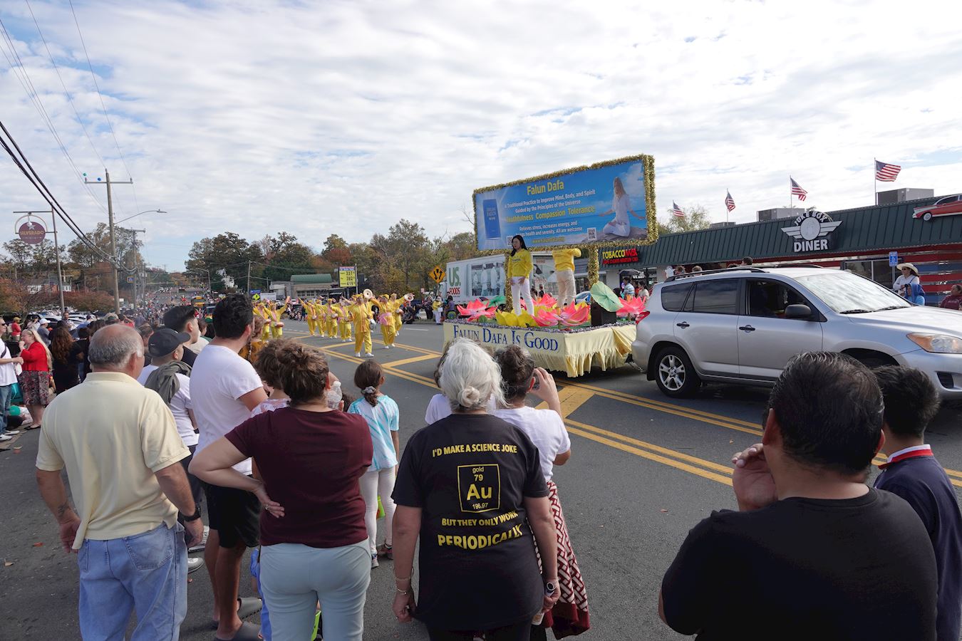 游行队伍沿着哥伦比亚派克大道行进,沿途经过安嫩代尔繁华的商业区。卡通人物,中学军乐队,古董车,童子军,欢快的玻利维亚舞蹈,法轮功学员的腰鼓队……赢得了观众的阵阵掌声。两位年轻的法轮功学员在花车上演示功法,很多人第一次听说法轮大法,渴望了解更多的信息。