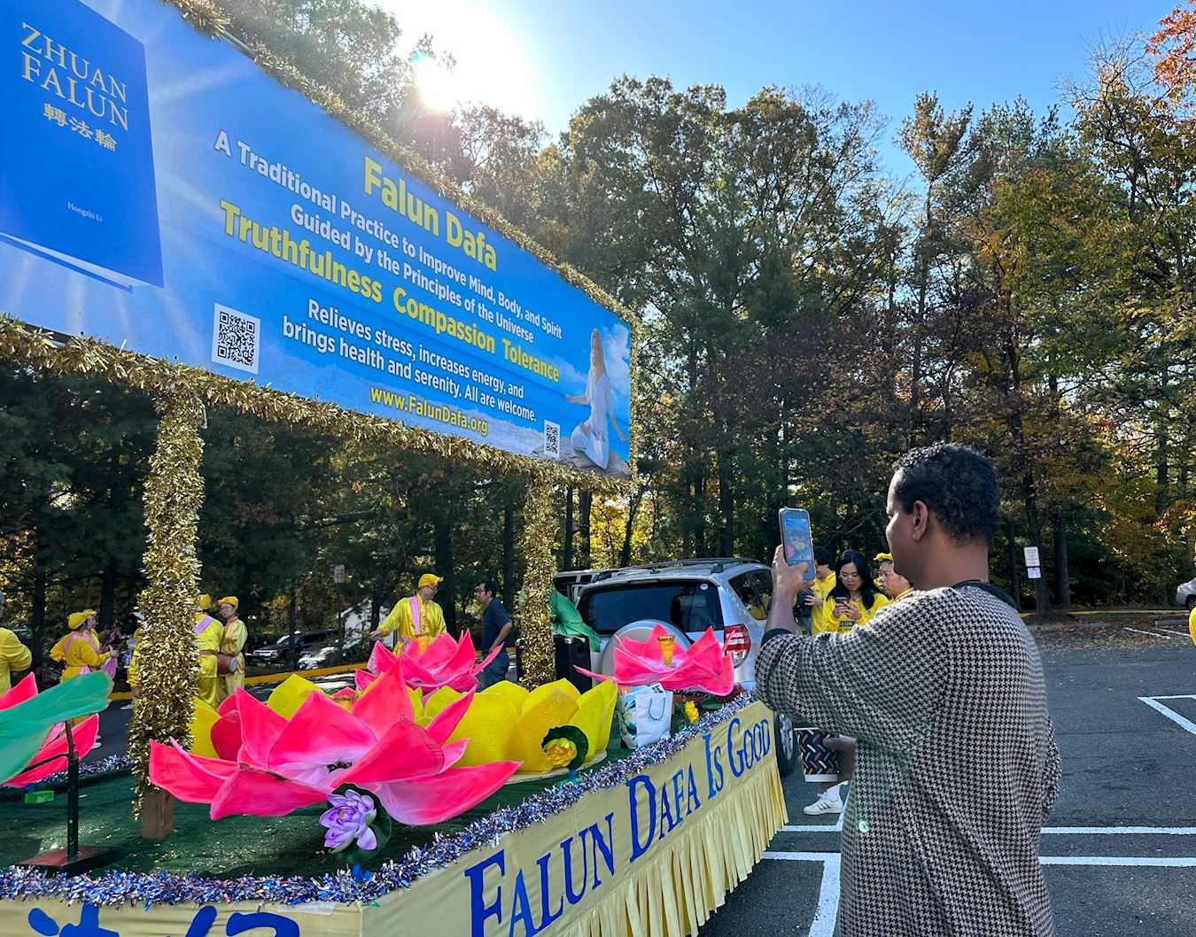 在游行的起点,从事电脑工作的弗吉尼亚州居民尤哈尼斯(Yohanes)用手机拍下了花车上的展板。“我感受到这里散发的能量,平和,宁静,可以舒缓压力,我对自己说,快去了解一下”,尤哈尼斯说。他说这是第一次听说法轮大法。他打算到法轮大法网站查询更多的信息。