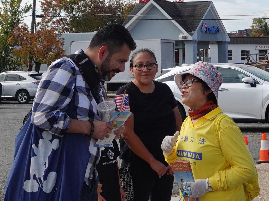 阿历克斯(Alex)看过手中的法轮功真相传单后,连声说:“很好,很好,非常好,我要在网上学功。”