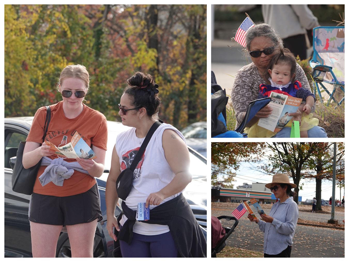 ![]() 图9~10:法轮功学员向沿途的观众递上真相传单,并介绍法轮大法。 |