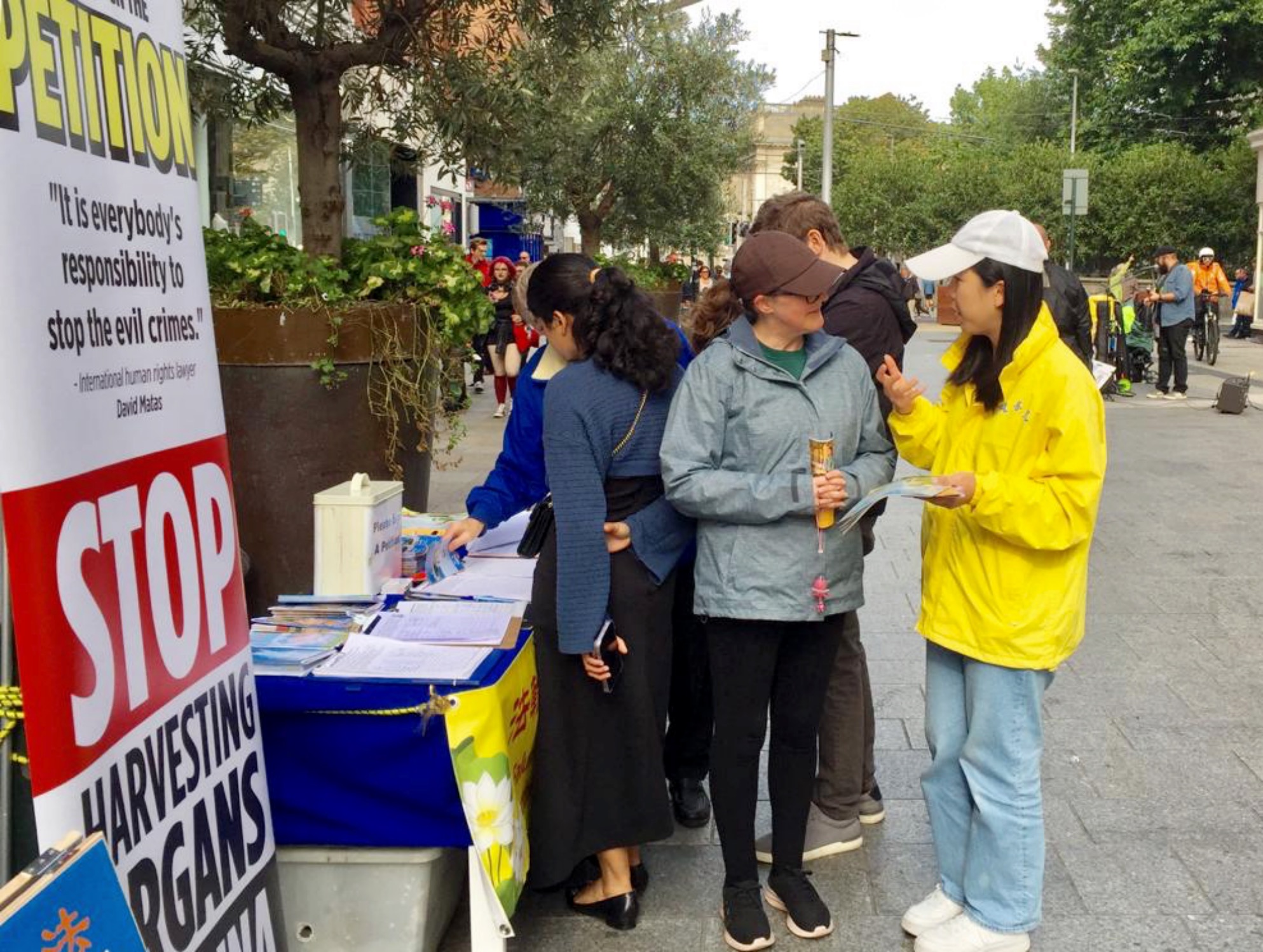 这是来自上海的王女士发出的疑问。一位女士来到了真相点前。看着学员们伴随着音乐声,展示法轮功的第五套功法,王女士很快的与法轮功学员攀谈了起来。 王女士说她是附近一所重点大学的学生,在学校里学了一门有关中国文化的课程,有介绍法轮功,说法轮功源自于中国,信仰真善忍,这是她在国外第一次听到法轮功,她很好奇,为什么大学课堂里介绍的法轮功,和中国宣传的不一样。今天她在街上看到法轮功学员,就过来了解一下。
