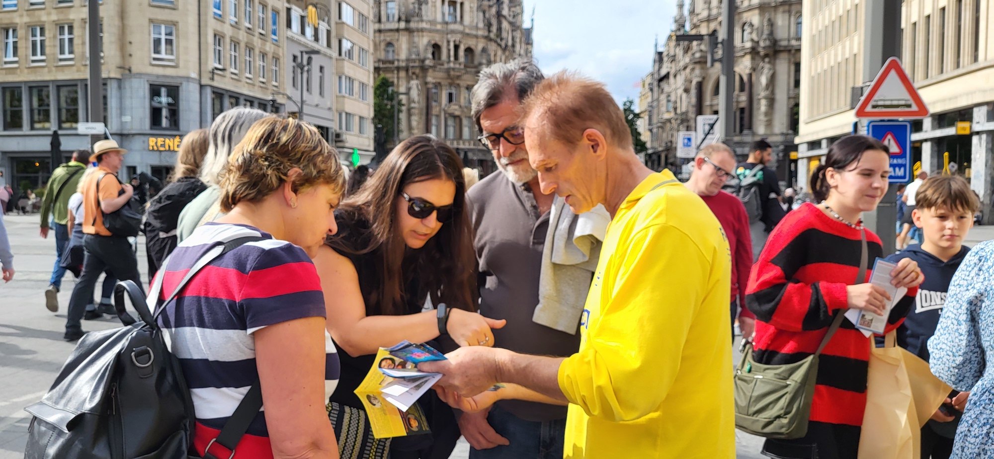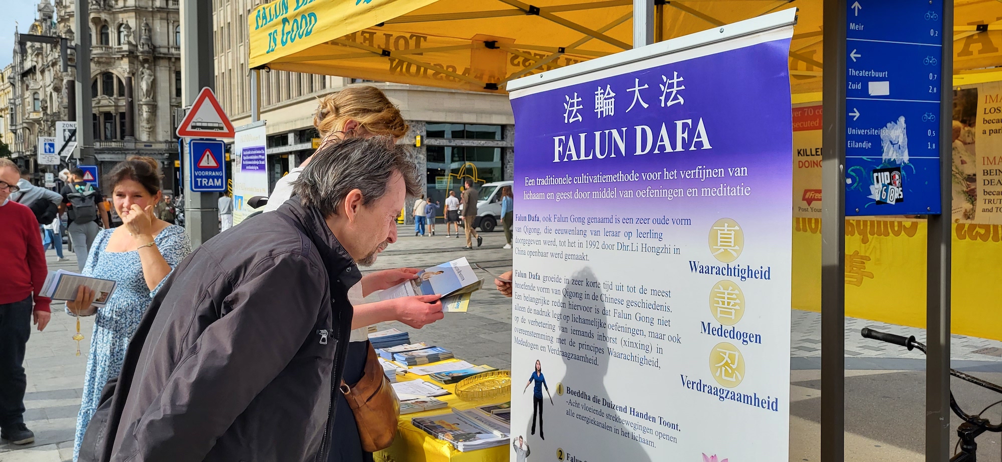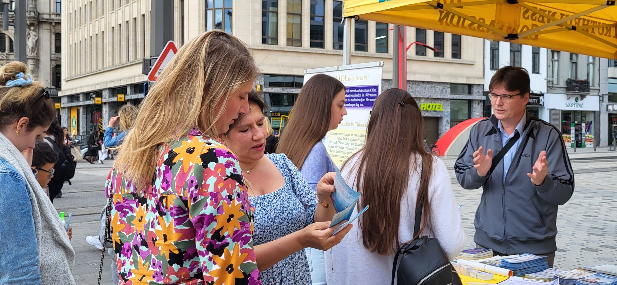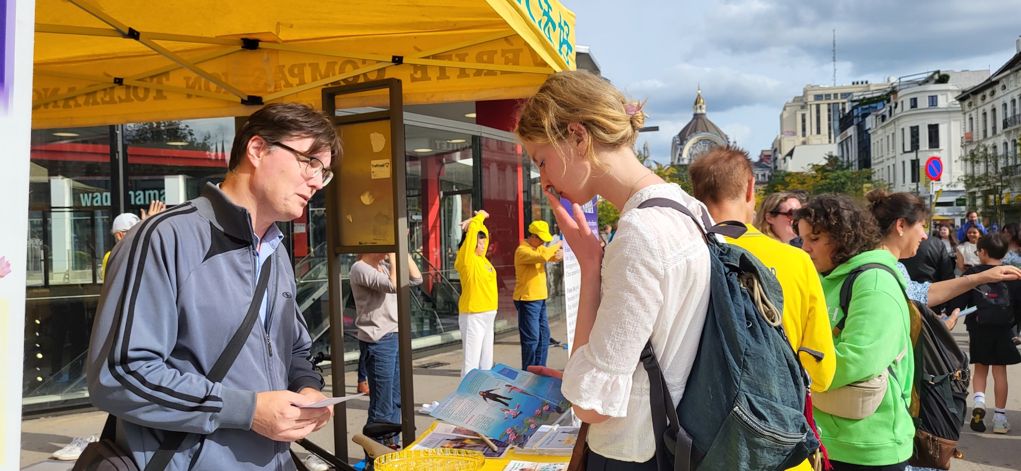 儿子莱恩(Len)和母亲莉芙(Lieve)母子在活动场地逗留了一个多小时;与几位学员交谈并了解了法轮功真相。莱恩希望知道在当今道德败坏的社会状态下,面对自己遇到的欺骗、欺侮等伤害,如何还能够做到真善忍?看到有这么多的学员在修炼,他们也想知道法轮功学员是如何做到的?