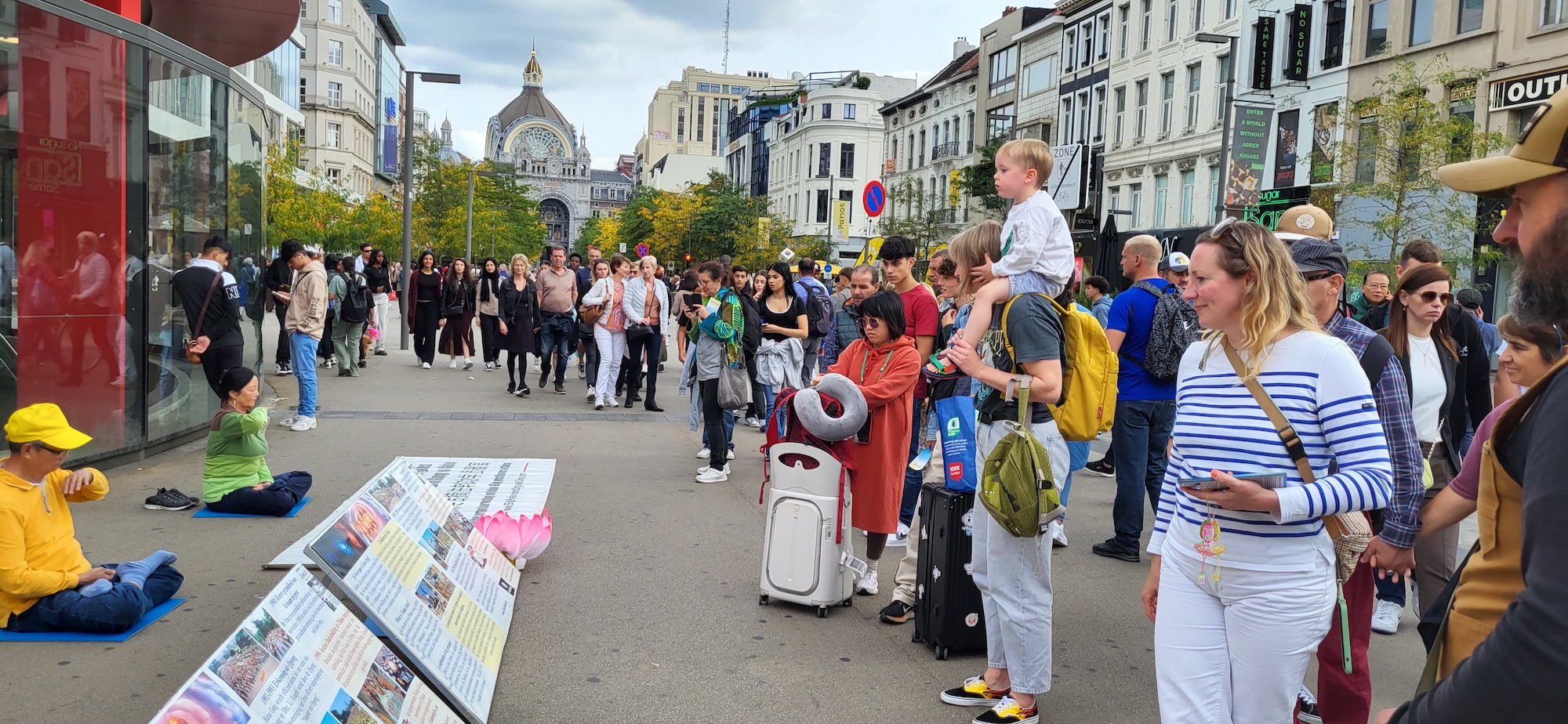 ![]() 图1~8:部分比利时安特卫普法轮功学员们在市区弘法,很多人们驻足观看了解真相 |