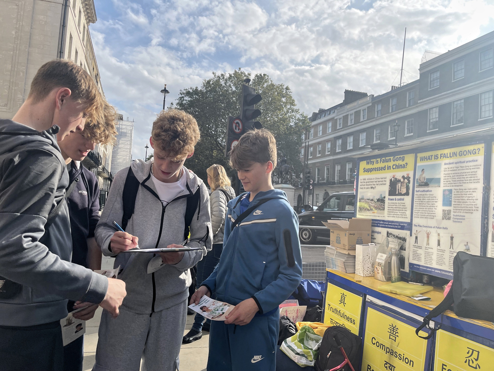 ![]() 图4:路过的学生在请愿书上签名支持法轮功反迫害。 |