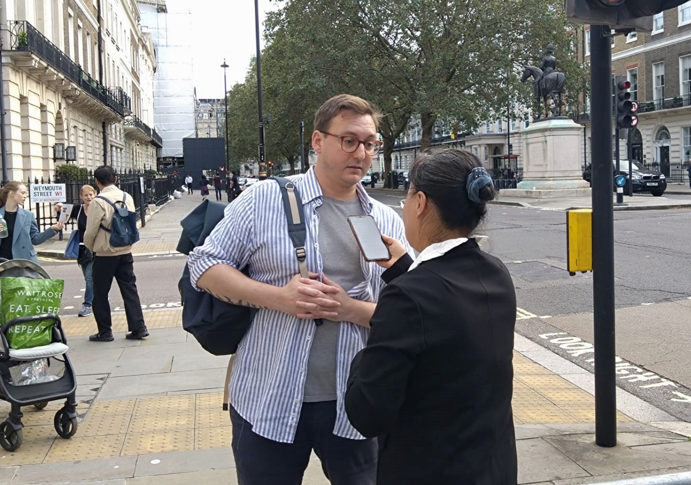 约翰(John)从事出版工作,他和太太路过这里对征签非常支持。他们最近去过柏林,他读到了纳粹主义的历史,很同情生活在暴政下的人们。他说,“真、善、忍原则是和平的希望,但中国(共)政府害怕这个普世价值,就迫害你们。”