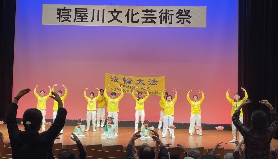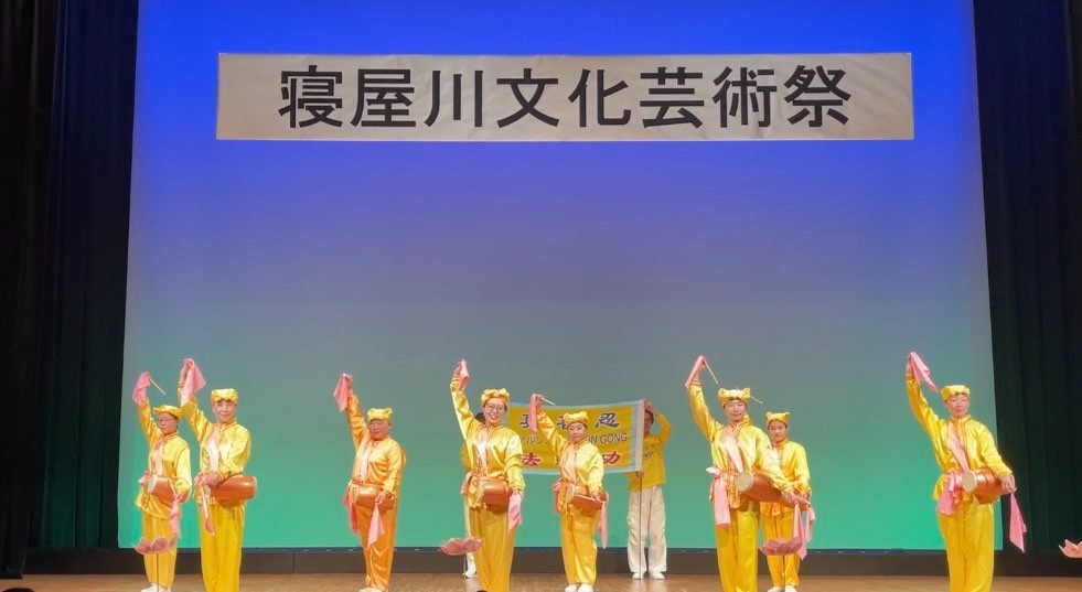 艺术节首日上午,由关西法轮功学员们组成的“关西腰鼓队”在台上表演了四个曲目。学员们向观众解说每个腰鼓的动作都有其意义,演出结束后,观众们鼓掌致谢。