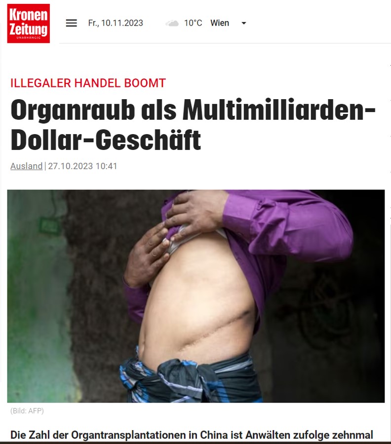 ![]() 图1:奥地利《克朗报》发表题为“把活摘器官作为数十亿美金的生意”的网络报道(网页截图) |