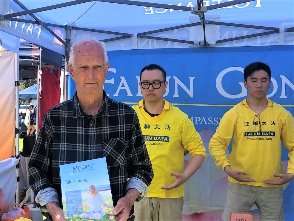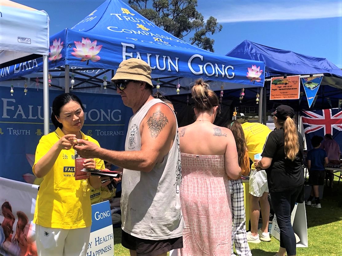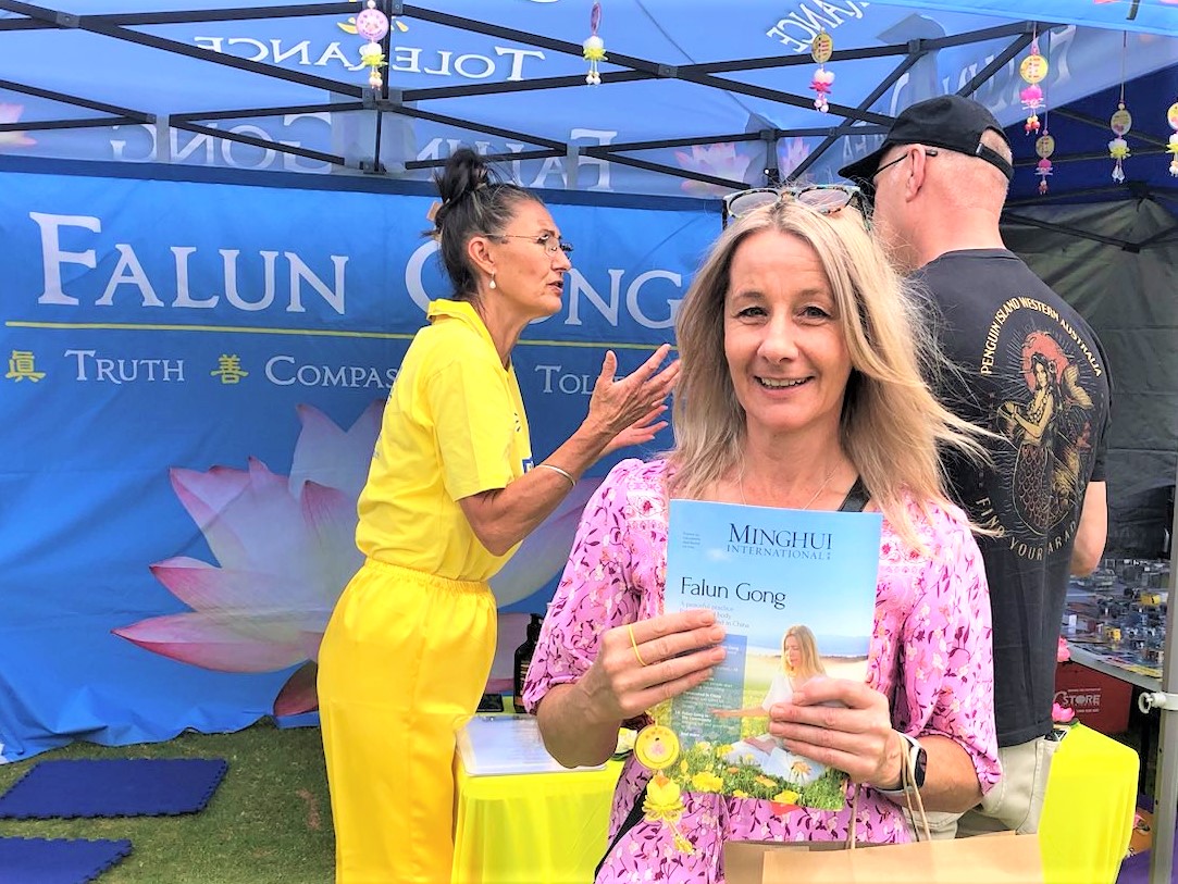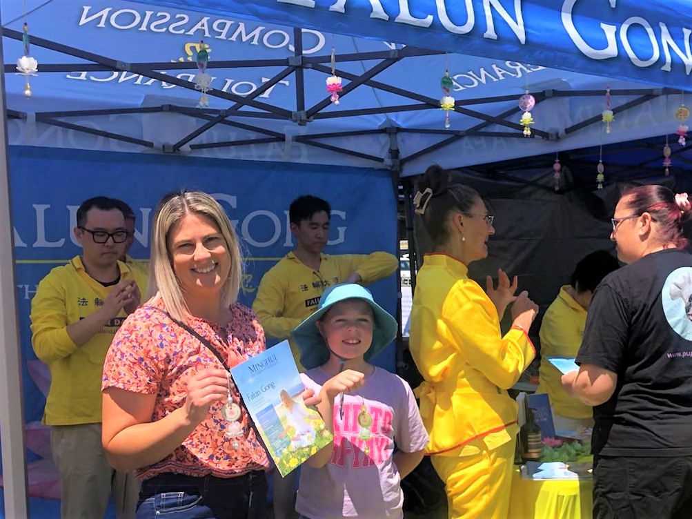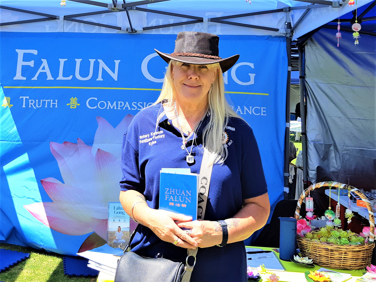社区支持工作者凯莉·莫里斯(Kylie Morris)表示喜爱法轮功学员的展位,并被展位和学员的着装所吸引,她说:“我喜欢(大法)的黄色,这里是如此平和,我需要这些,在生活中我需要更多的祥和与平衡。是的,我想修炼法轮大法。”