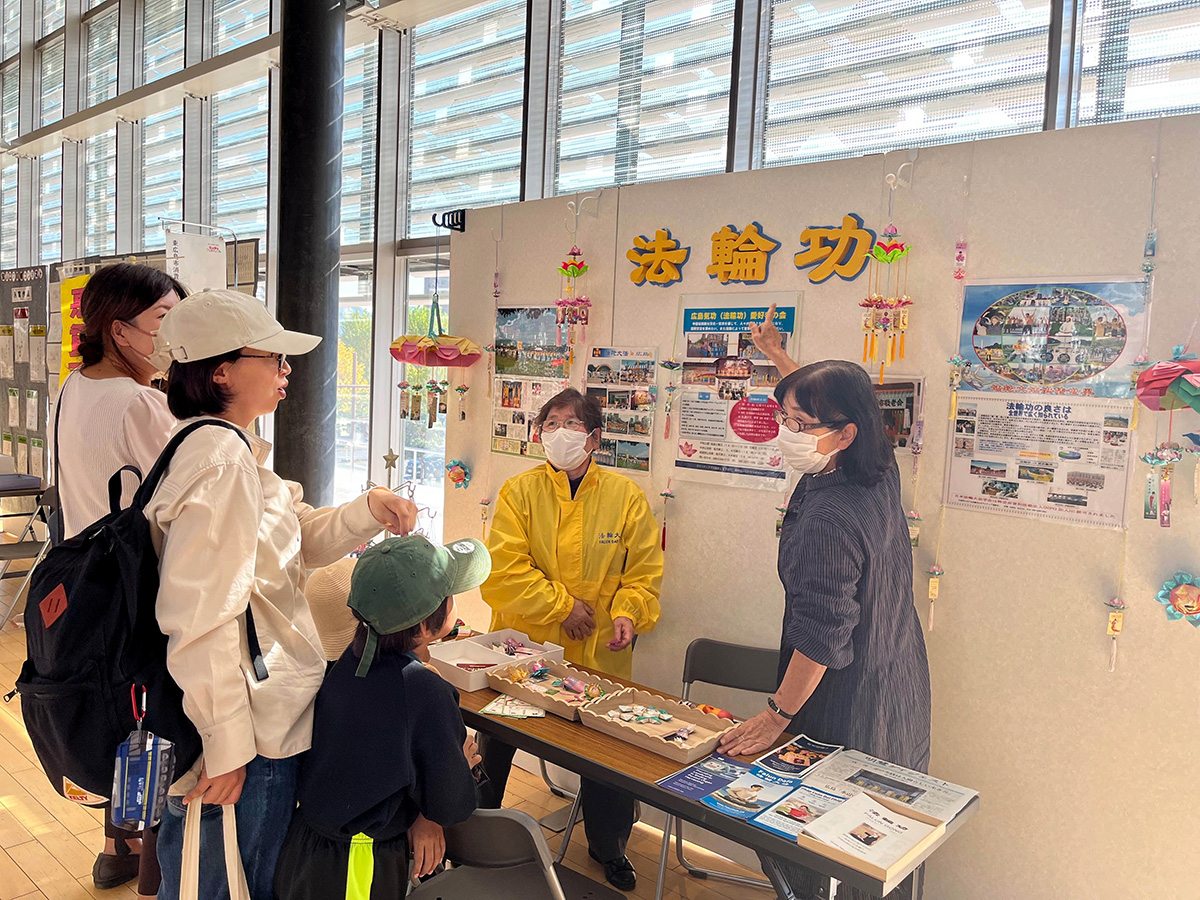 二零二三年十一月三日至四日,法轮功学员在“生涯学习庆典”中设置展位,发资料,介绍法轮功。首日,参加开幕式的东广岛市市长和多位议员来到展位前了解真相。