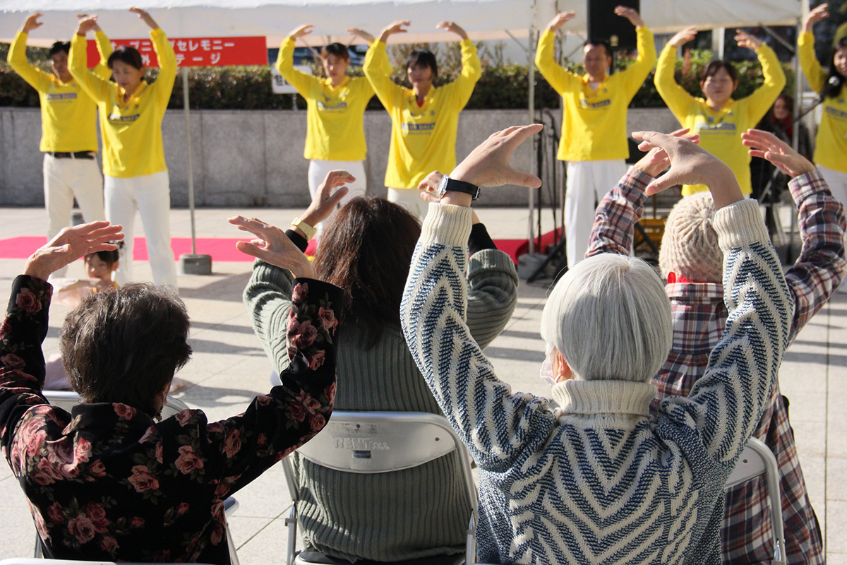 在都市建设市民交流庆典中,法轮功学员在演示功法时,现场的工作人员也跟着学炼,有的还表示:“学炼的时候,一股热流通透全身。”