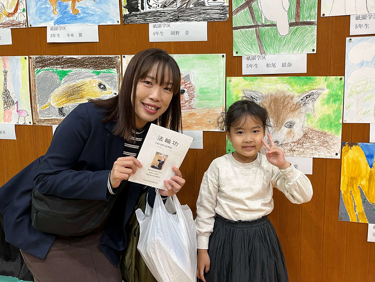 法轮功学员在只园西公民馆舞台演示法轮功的功法动作时,有一个叫山名香(Yamana kaoru)的小女孩和大人一样从头至尾学炼下来,而且动作准确。她的妈妈一直在旁边笑眯眯地看着全过程,小女孩学得很开心。