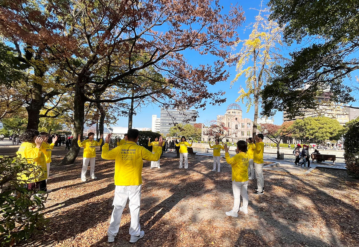 当地法轮功学员每个周日下午都在原子弹被爆遗址处的广岛和平公园集体炼功。十一月十九日下午,法轮功学员和平时一样来到和平公园集体炼功。有两位六十岁左右的女士看到法轮功学员在炼功,也加入进来学炼。她们临走时,每人拿了一份资料准备回家阅读。
