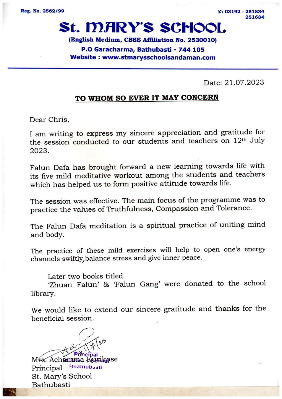 回忆起这段经历,她说:“几乎所有学校的校长都认同法轮大法真、善、忍的修炼准则,他们认为遵从真、善、忍在生活、学校、家庭和社会中很重要。他们不敢相信我年近七十二岁了,竟然克服重重困难来到这个小岛,只为传播这些美好的价值观。这是他们普遍的感受,他们还对我说,‘神与你同在’、‘愿神帮助你,保护你。’”