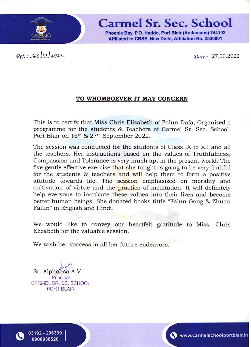 在举办了法轮大法弘法讲座后,多所学校向克里斯蒂娜颁发感谢信。