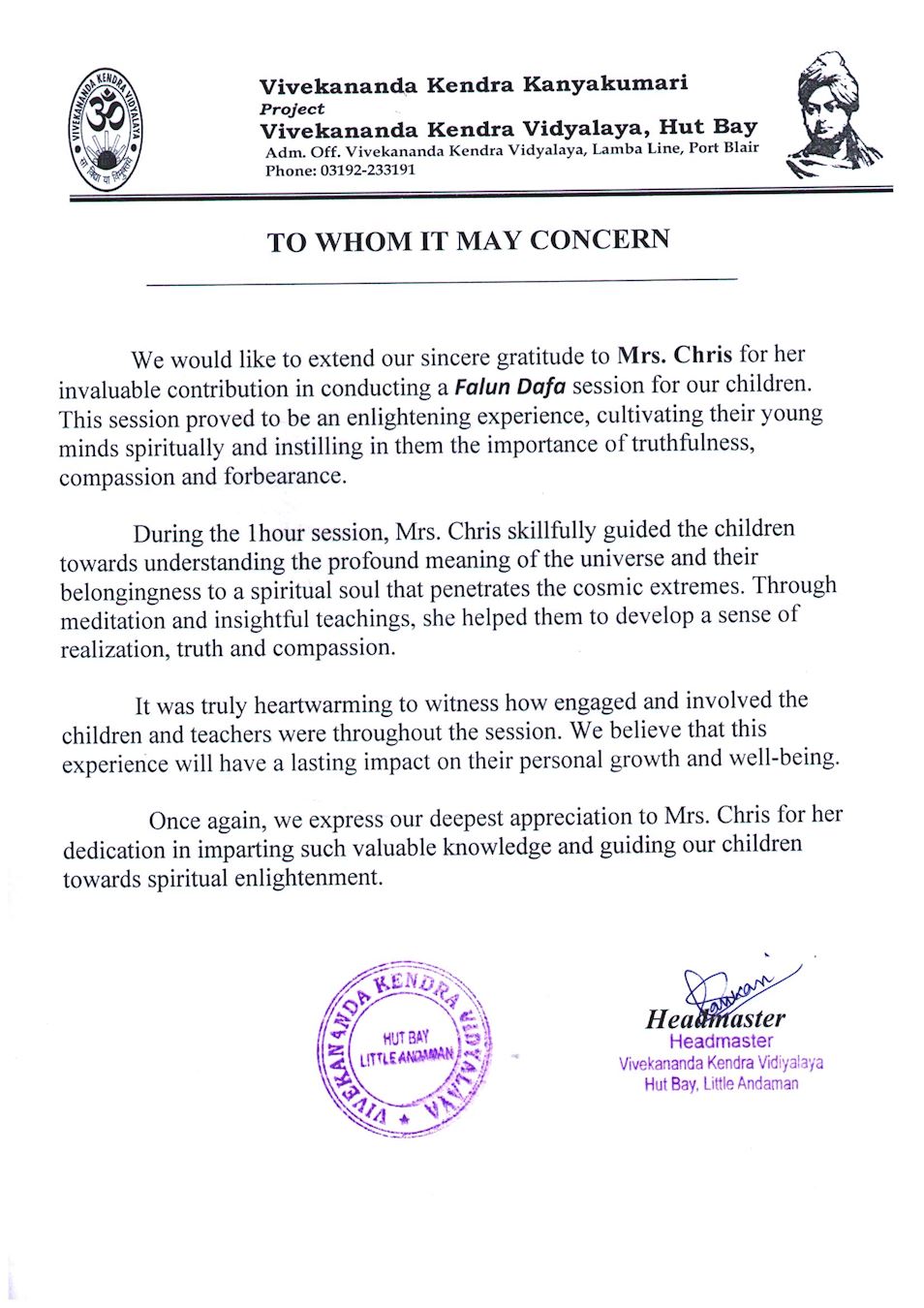 “他们的缘份到了,我感到很荣幸,我只做了一点事情,把这些材料带给他们。我要感谢所有从印度各地寄资料到布莱尔港的学员们。”