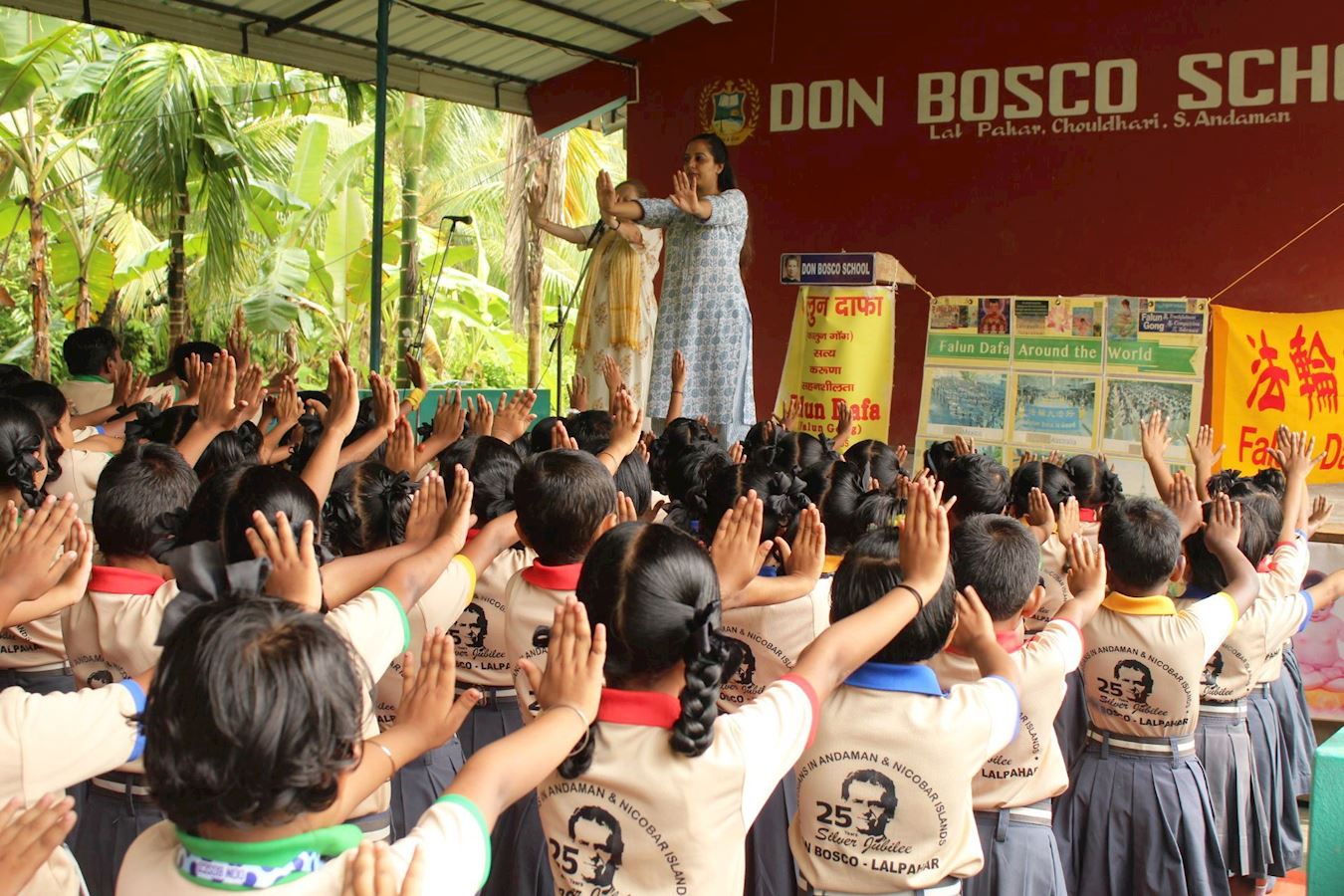 ![]() 图7:在安达曼唐博斯科(Don Bosco)学校,学生们正在学炼法轮功功法。 |