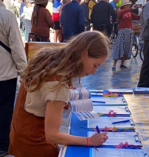 游客艾莲娜(Elena)在阅读了法轮功真相传单后,对中共活摘法轮功学员器官的恶行震惊不已。她签署了制止迫害的请愿书,在征得法轮功学员同意后拿走了更多的真相传单,她表示会把传单分发给亲友同事们,让大家都来关注在中国发生的残酷迫害。