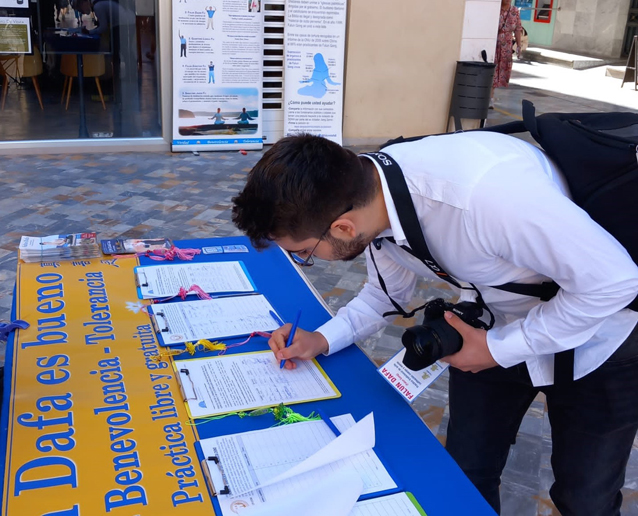 安海尔(Ángel)是一名摄影系学生,他在法轮大法信息展位了解到了中共活摘器官的暴行,深感震惊。他觉得自己应该为制止这种残暴罪行做些什么,因此他请求拍摄一些照片,通过这些照片让他的老师、同学、朋友以及更多的人了解到在中国发生的迫害。他说:“现在新闻中经常谈论战争,但在中国发生的这种令人发指的对法轮功的迫害以及对活人器官的非法摘取则更加严重和恐怖,而新闻却鲜有报道。”安海尔希望他拍摄的照片能够让更多的人知道真相,共同谴责中共的邪恶行径,为制止迫害尽一份力。