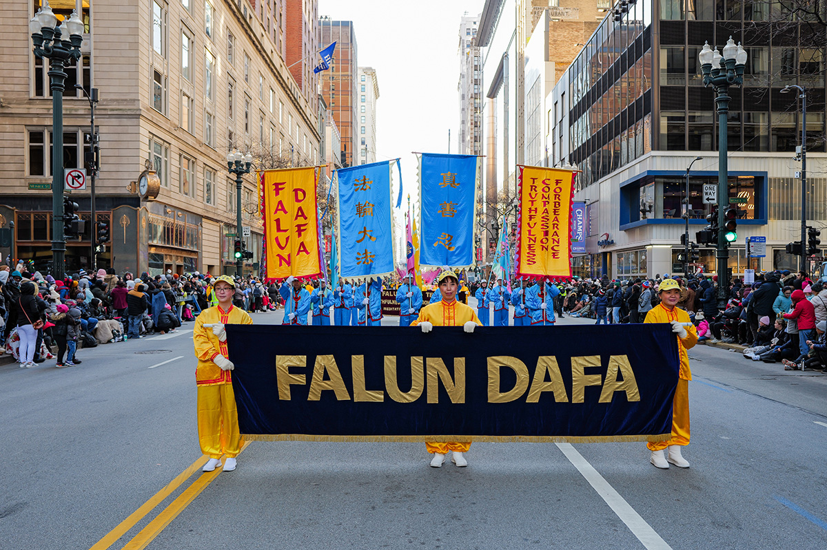 ![]() 图12:法轮功学员亚沙·萨门-辛普森(Jasha Sommer-Simpson)参加芝加哥芝加哥感恩节大游行。 |