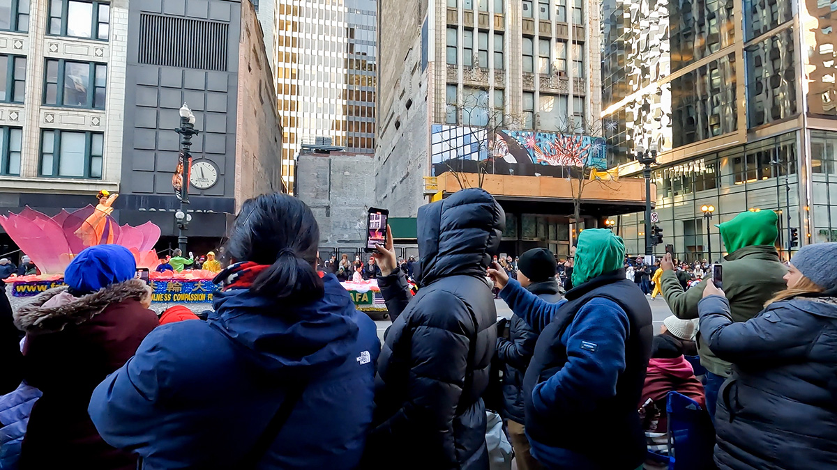 ![]() 图7:二零二三年十一月二十三日,在芝加哥感恩节大游行中,非常多的观众用手机拍照、录像,记录法轮功游行。 |