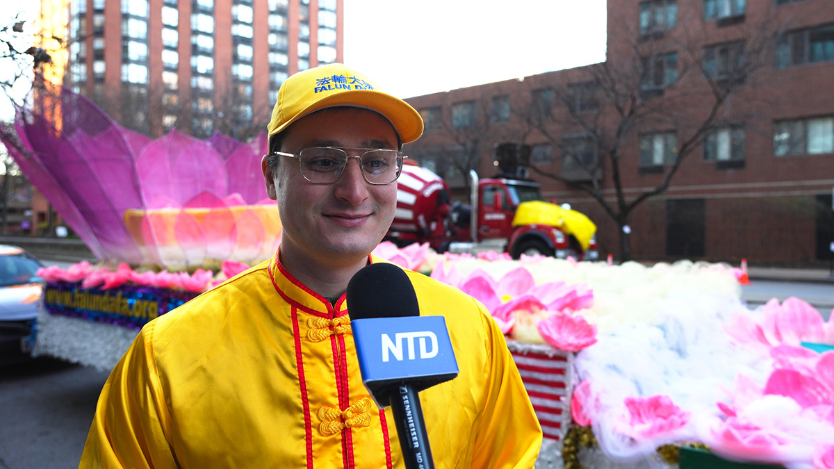 法轮功学员亚沙·萨门-辛普森(Jasha Sommer-Simpson)几乎每年都在花车上做功法演示,他对自己能成为花车的一员感到荣幸,