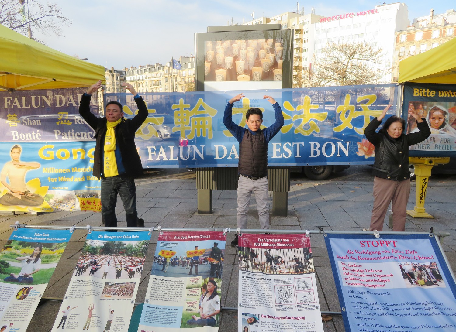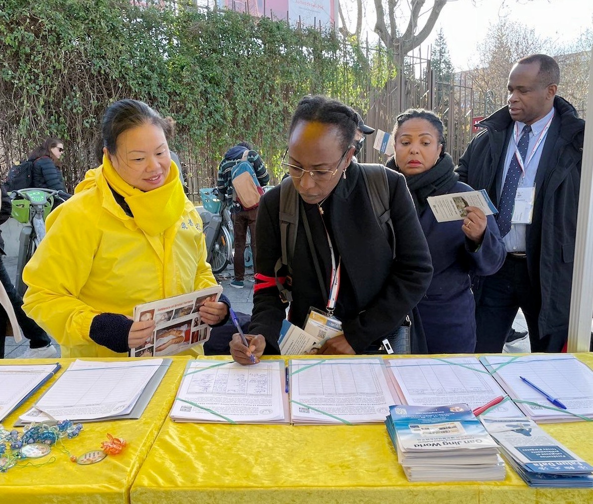 展览会外的入口处,法轮功学员设置了信息台,向人们分发真相资料、展示法轮功功法、征集签名反迫害。
